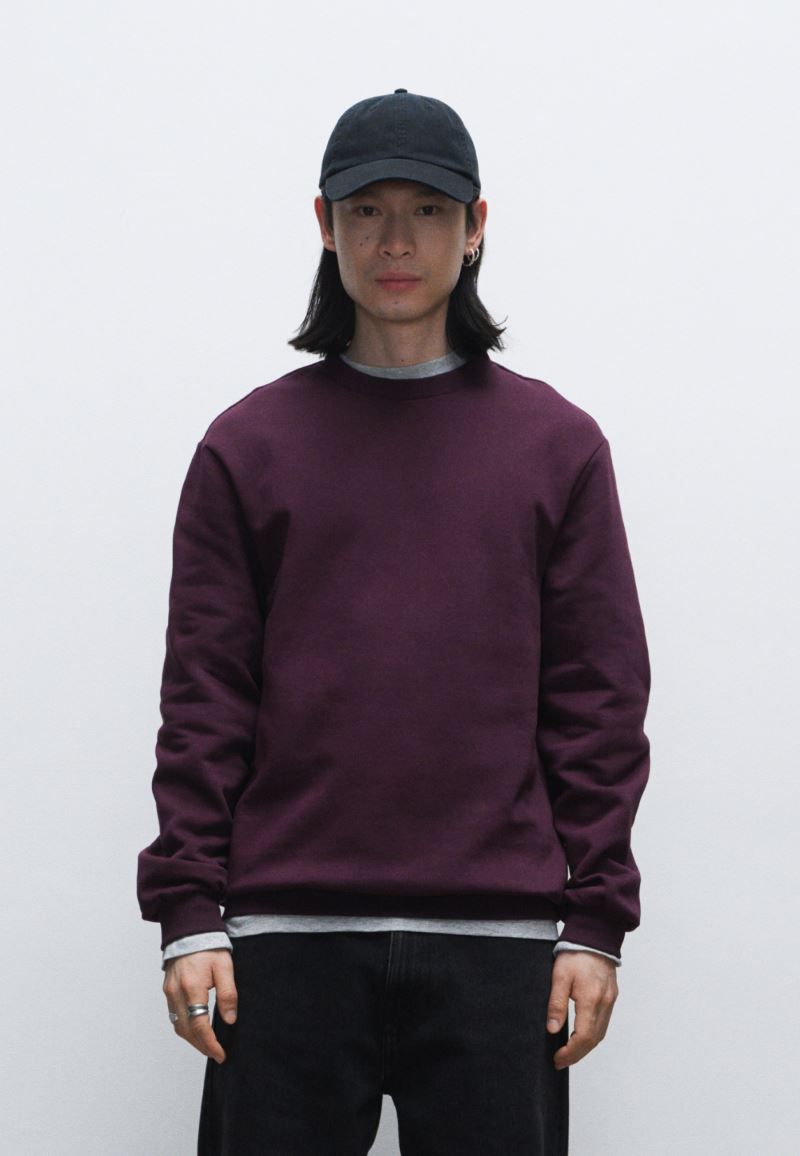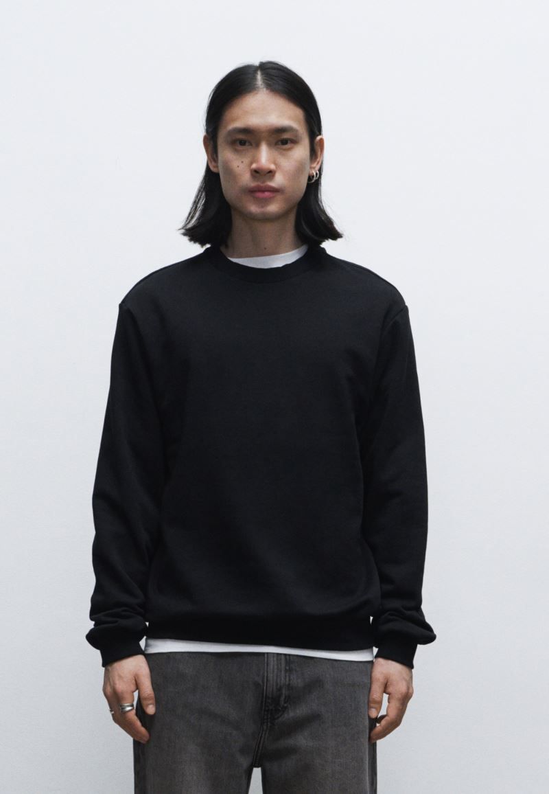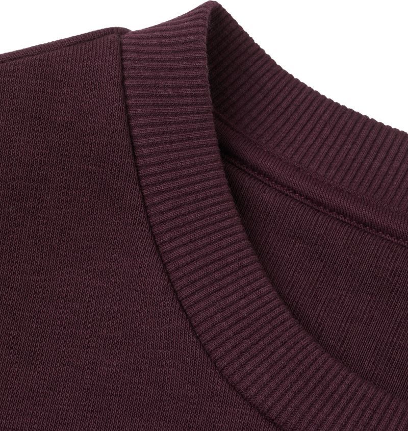 Straight cut, round neckline, halfmoon in neck, necktape, 2×2 ribbed cuffs at neck, sleeves and hem, chain stitch on the shoulder seam, soft touch, brushed inside, neutral size label, not suitable for tumble drying, do not dry clean.