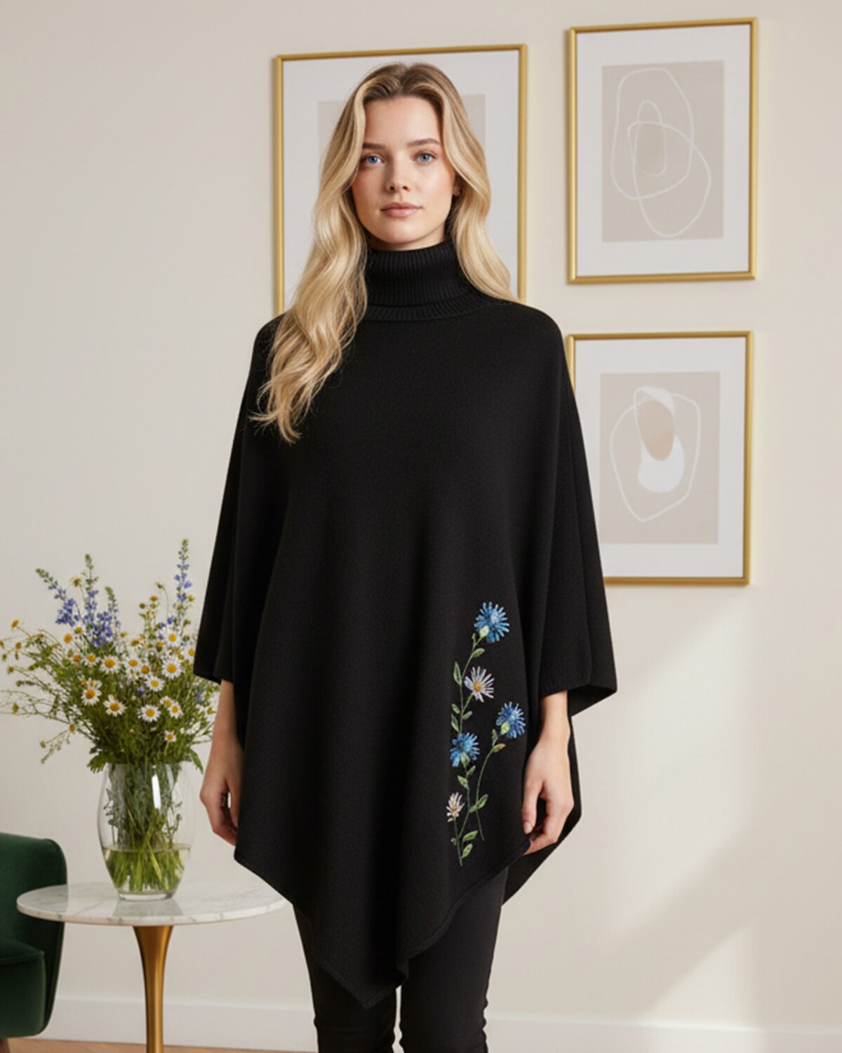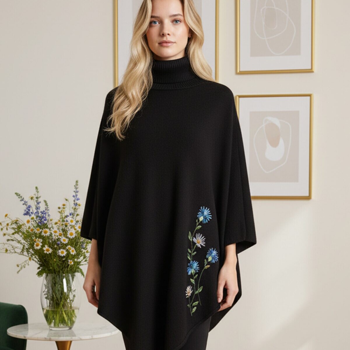 Kõrge kaelusega mõnusast pehmest kudumist soe pontšo tootjalt VILA, DesigRi disainitud masintikandis rukkilille motiiviga.