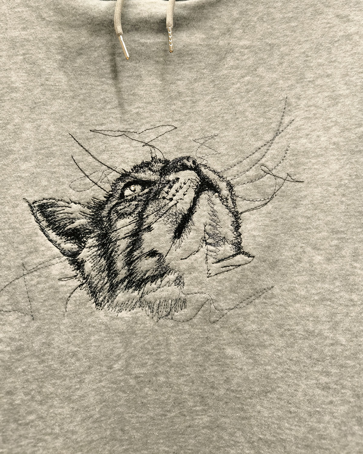 Kahekihilise kapuutsi, soonikutega allääres, uhutud sisepinna ja hallisäbruline sirgelõikeline pusakleit masintikandis kassipildiga Cyncopia Embroidery kollektsioonist.