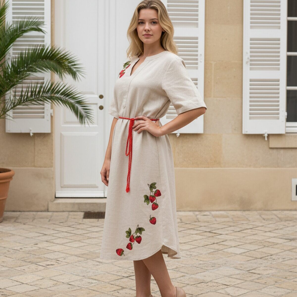V – ava, lühikeste varrukate ja masintikandis maasikatega redisainitud linasegune kleit-tuunika M suurusele. Kleidi pikkus 97cm, rinnaümbermõõt 94 cm. Tikandipilt ei kulu ja seda võib triikida.