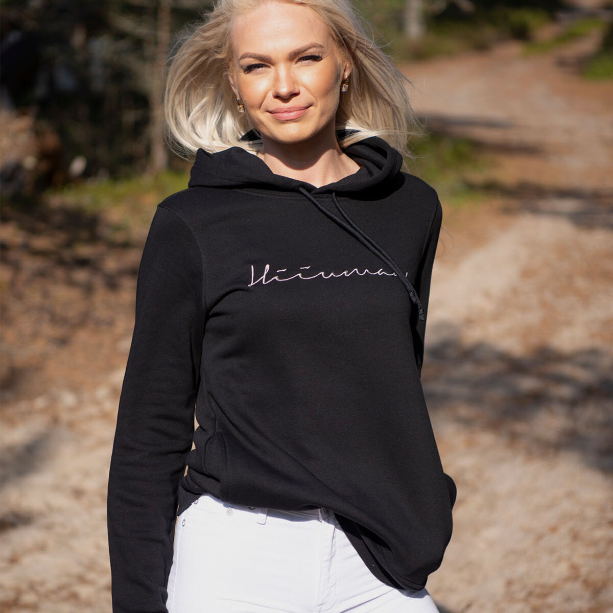 Kapuutsiga Hiiumaa pusa, küljetaskute ja uhutud sisepinnaga, millel masintikandis merelainestiilis kiri. Kirjastiili kujundaja/kuntsnik Valdek Alber on peitnud sinna sisse hiiu nalja – kaks ii-d tähendavad hiidlaste naerusuud ja täpid nendel hiidlaste naerusilmi.