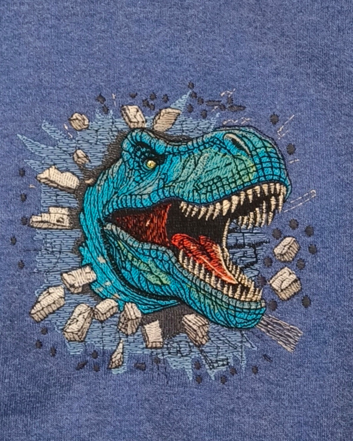 Masintikitud dinosaurusega mõnus pusa 7-8 aastasele 128cm lapsele, silmadeks efektsed Swarovski kristallid. Tikandipilt ei kulu ja seda võib triikida.