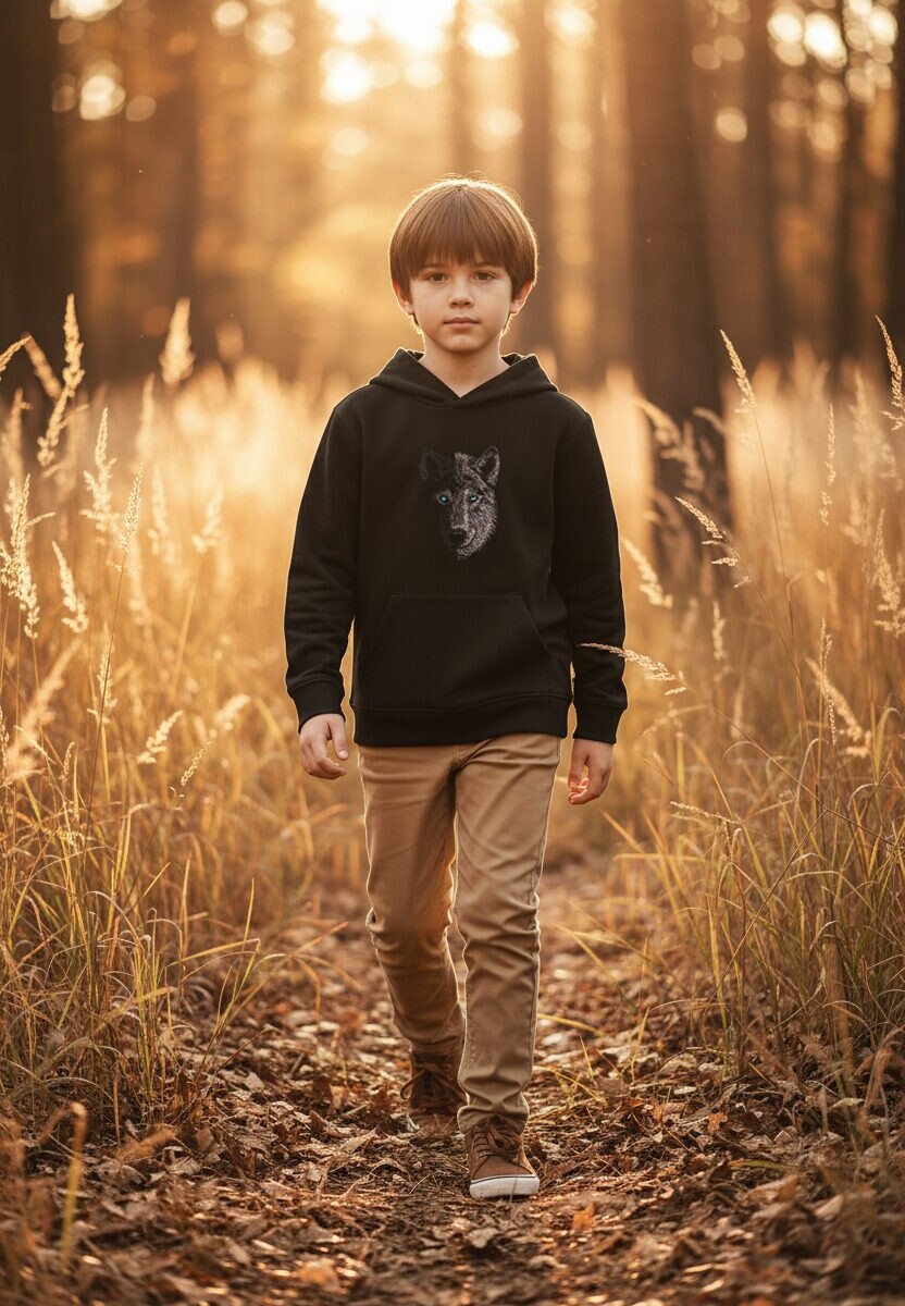 Kapuutsi ja kängurutaskuga laste pusa masintikandis hundipildiga Cyncopia Embroidery Design kolletsioonist, silmadeks efektsed Swarovski kristallid. Tikandipilt ei kulu ja seda võib triikida.