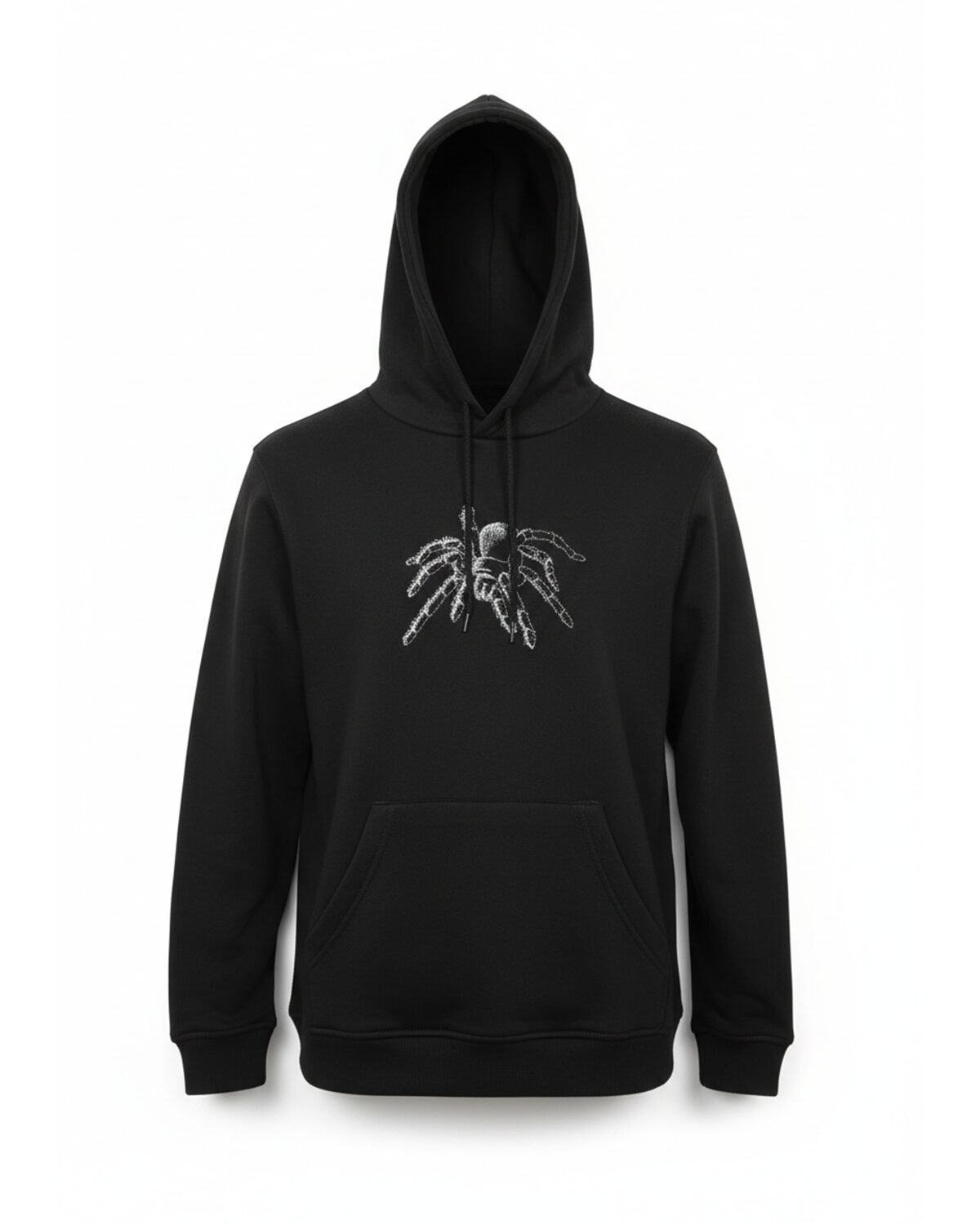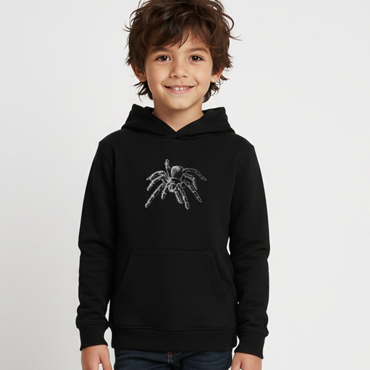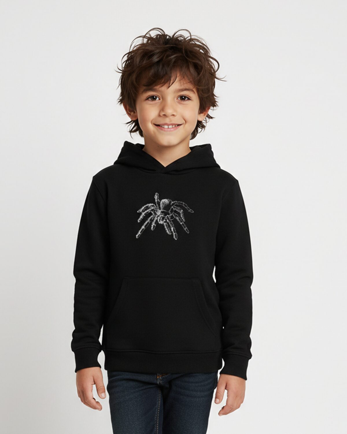 Mõnusalt külmavärinaid tekitava tikandipildi, kahekihilise kapuutsi ja kängurutaskuga pusa 7-8.a. 128cm pikkusele lapsele. Masintikandis ämbliku (pilt Cyncopia Embroidery disain) silmadeks efektsed Swarovski kristallid.