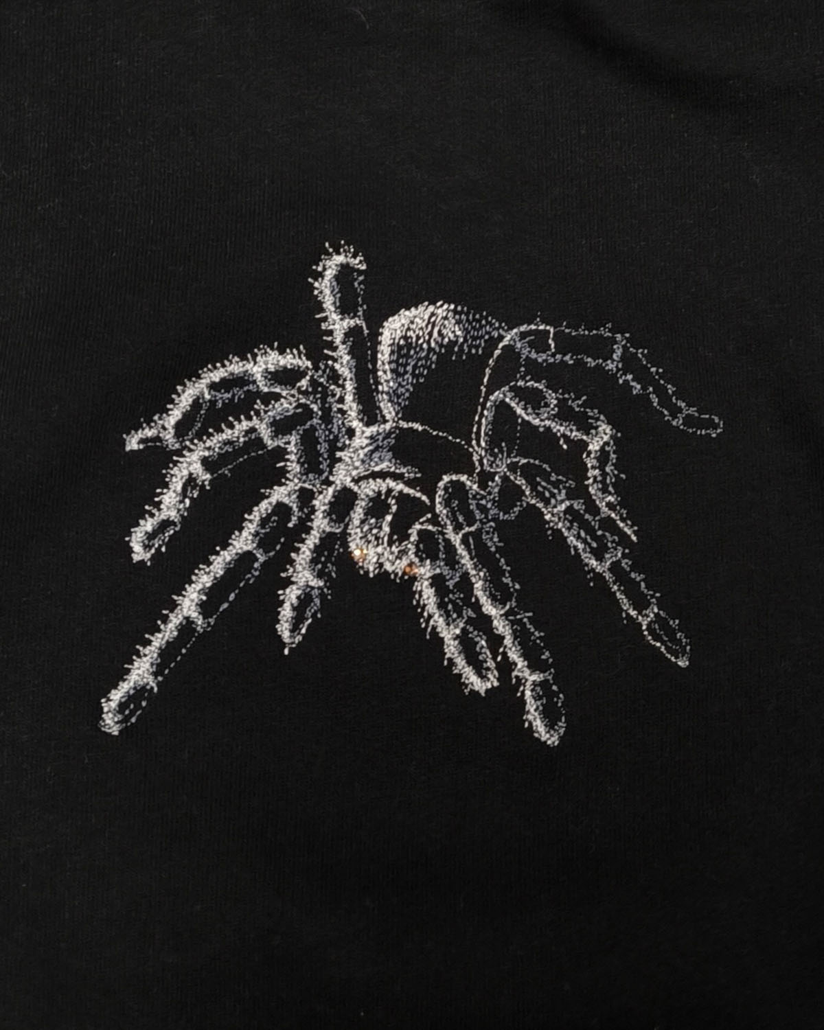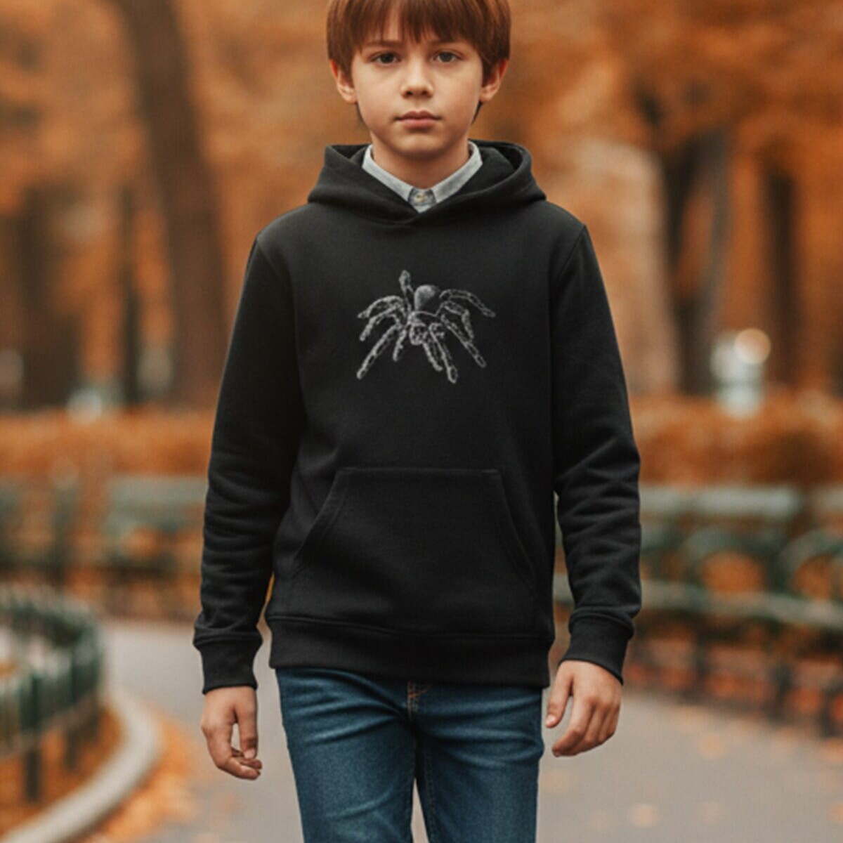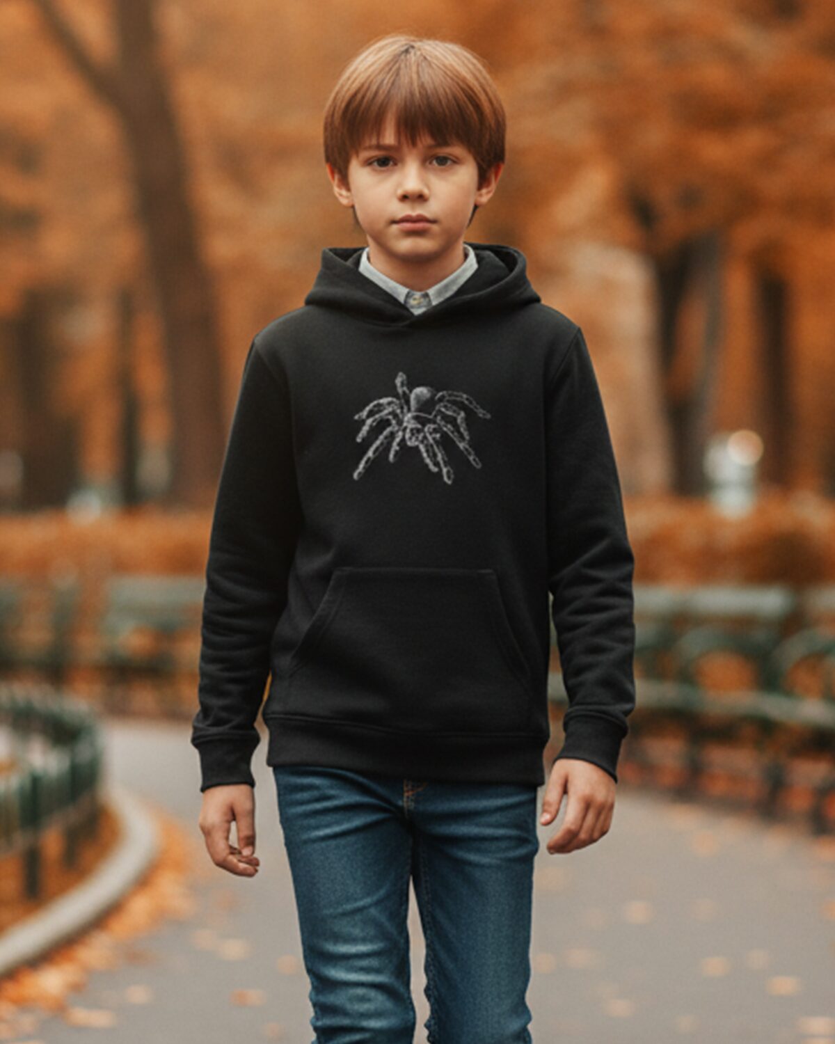 Mõnusalt külmavärinaid tekitava pildi, kahekihilise kapuutsi ja kängurutaskuga pusa 7-8.a. 128cm pikkusele lapsele. Masintikandis ämblikuga (pilt Cyncopia Embroidery disain), silmadeks efektsed Swarovski kristallid.