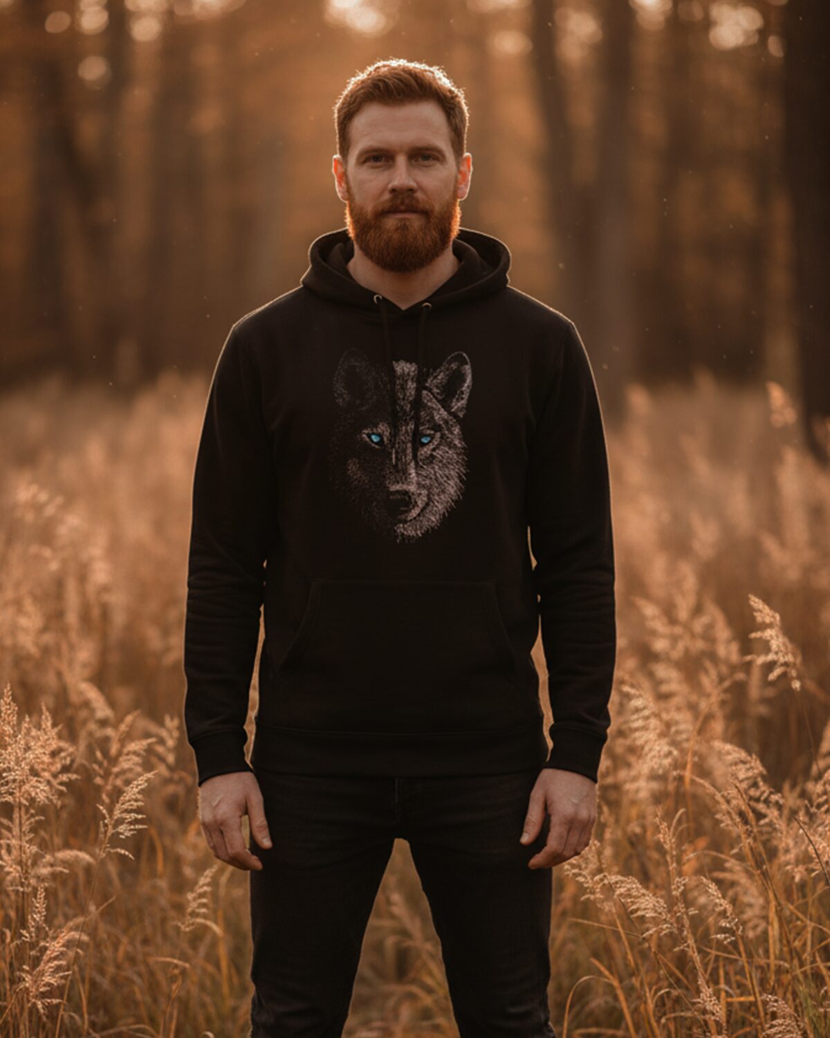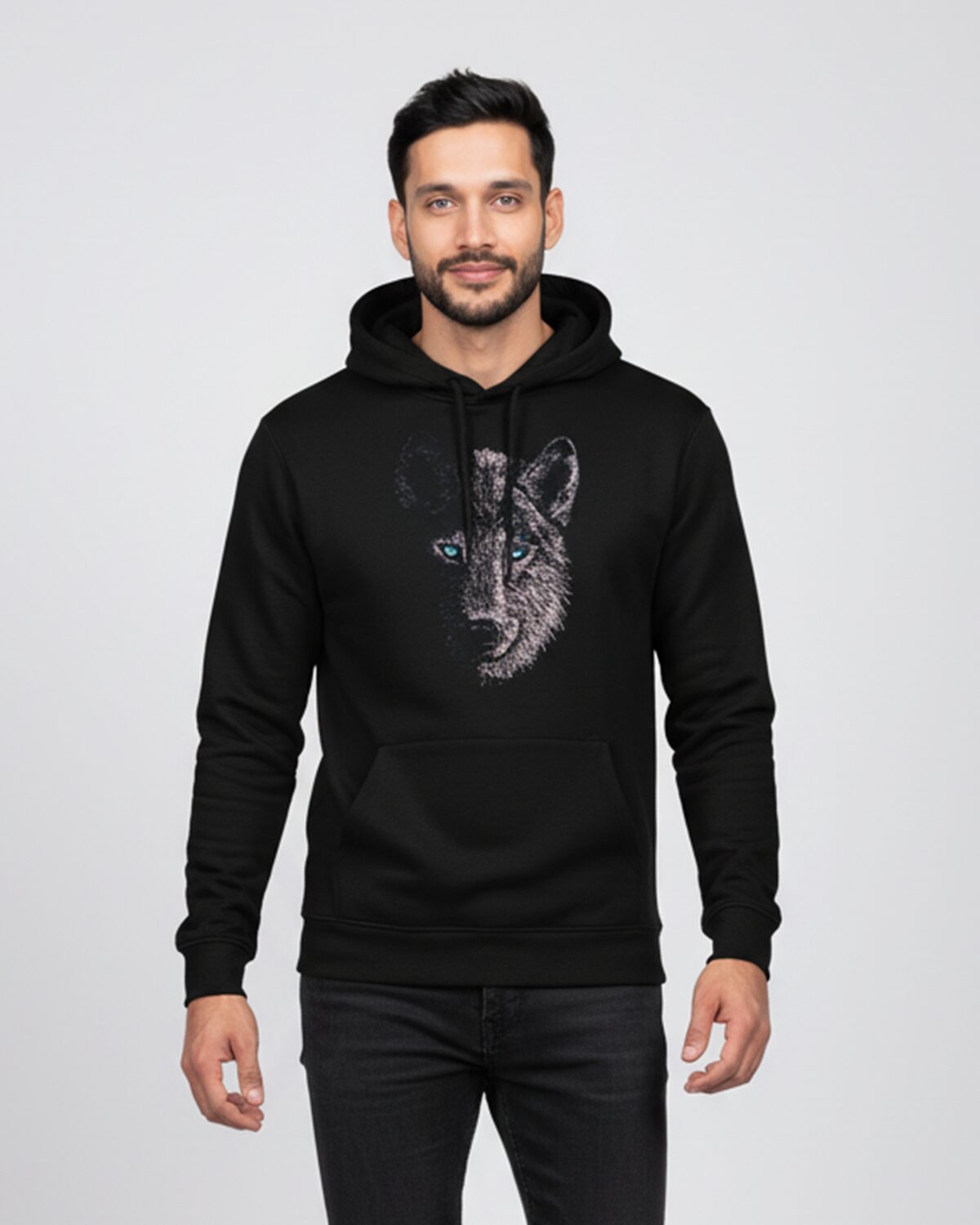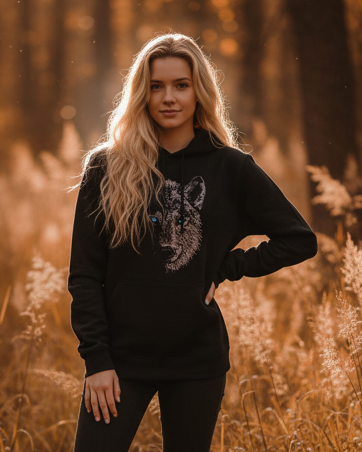 Masintikitud hundi pildiga, harjatud sisepinna, kahekihilise kapuutsi ja küljetaskutega mõnusalt keha järgi istuv pusa. Hunditikand Cyncopia Embroidery Design kollektsioonist, silmadeks sügavust andvad efektsed türkiissinised termokivid. Tikandipilt ei kulu ja seda võib triikida.