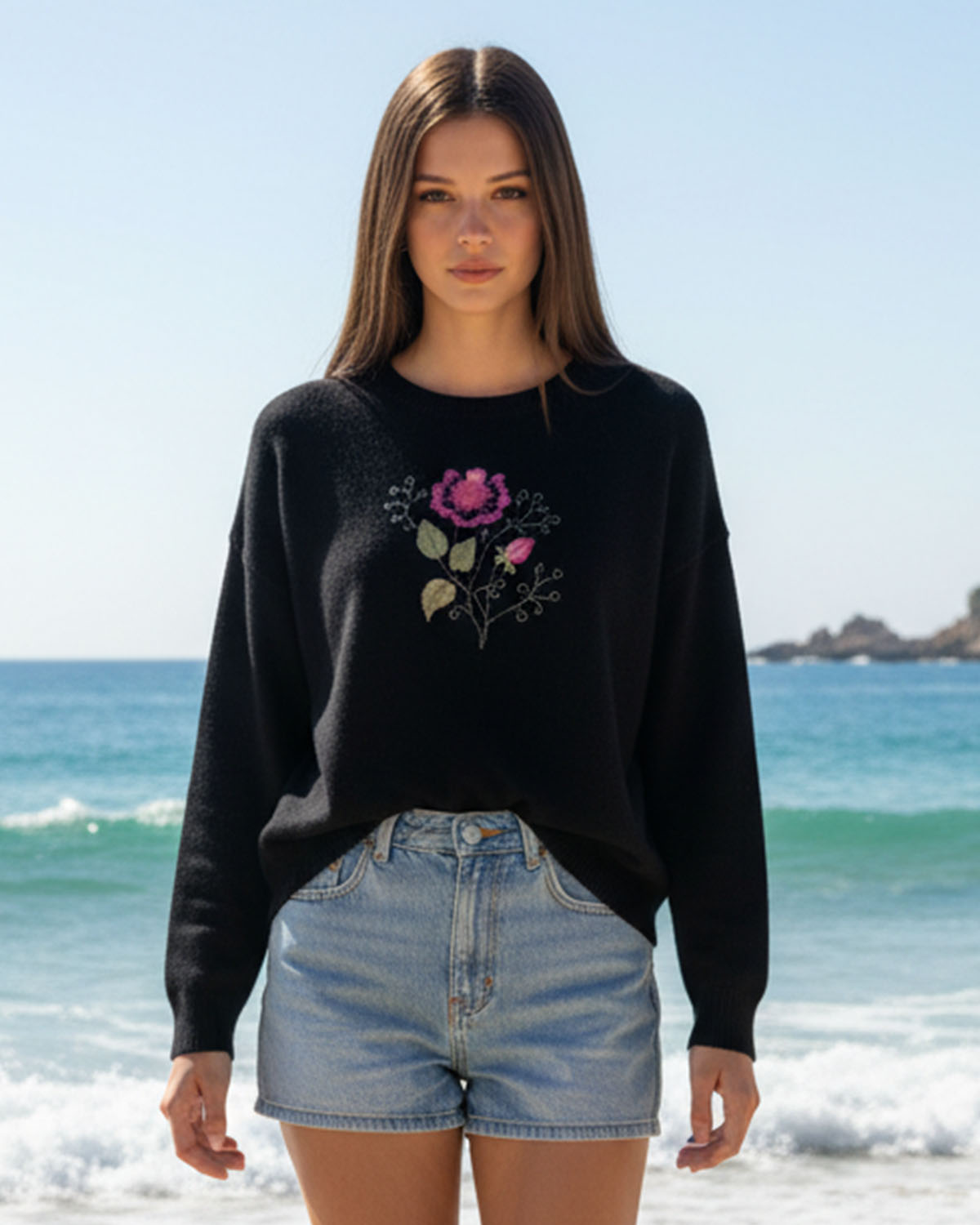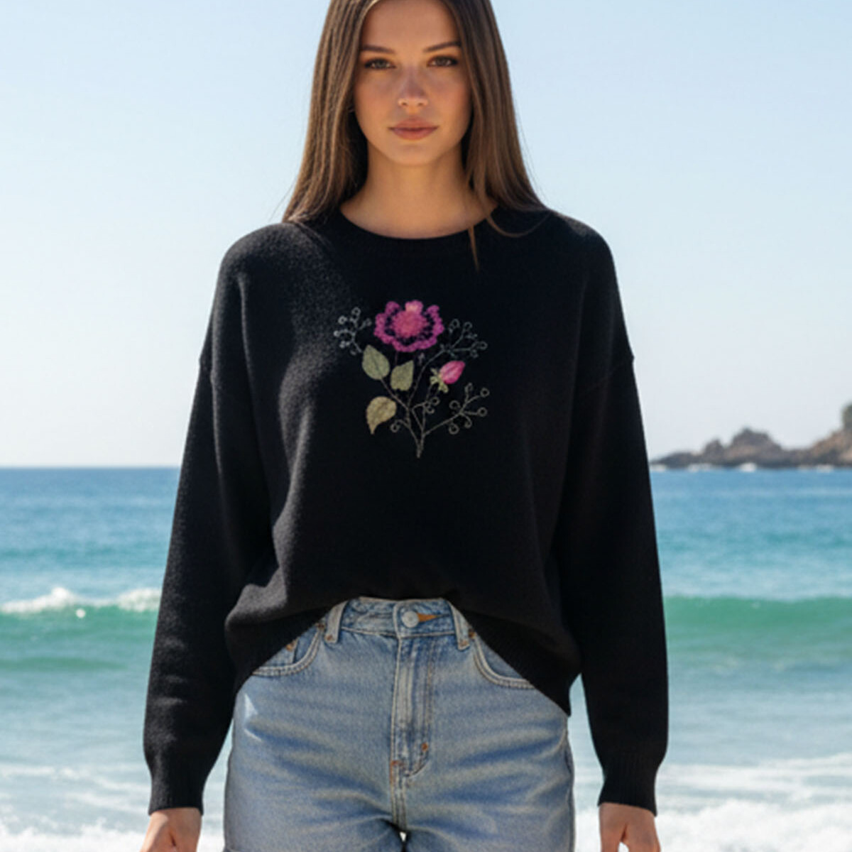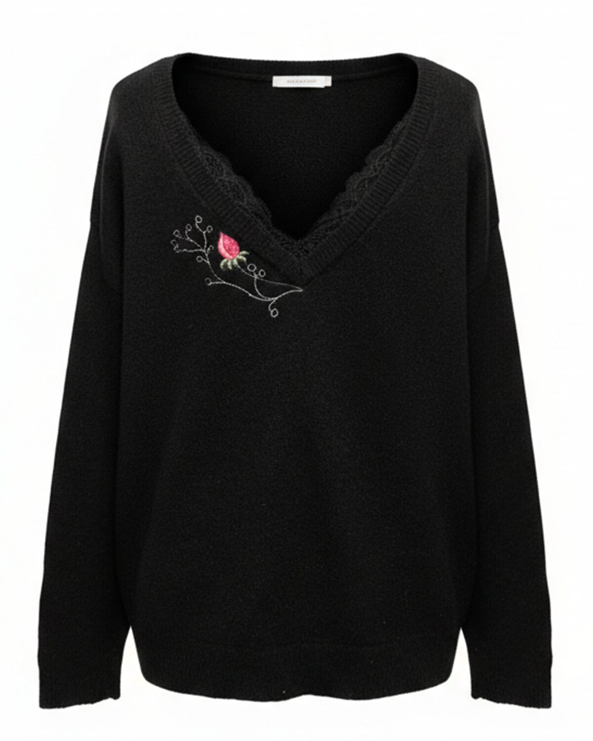 Mõnusalt pehme alpaka- ja villasegune naiselikult avaralõikeline kudum tootjalt Vero Moda, seljaosa avara V- avaga mille servas kitsas must pits. Redisainitud kampsun kauni lillemustriga nii ees- kui taga pool. Masintikandis pilt ei kulu ja seda võib triikidal madalal kuumusel.