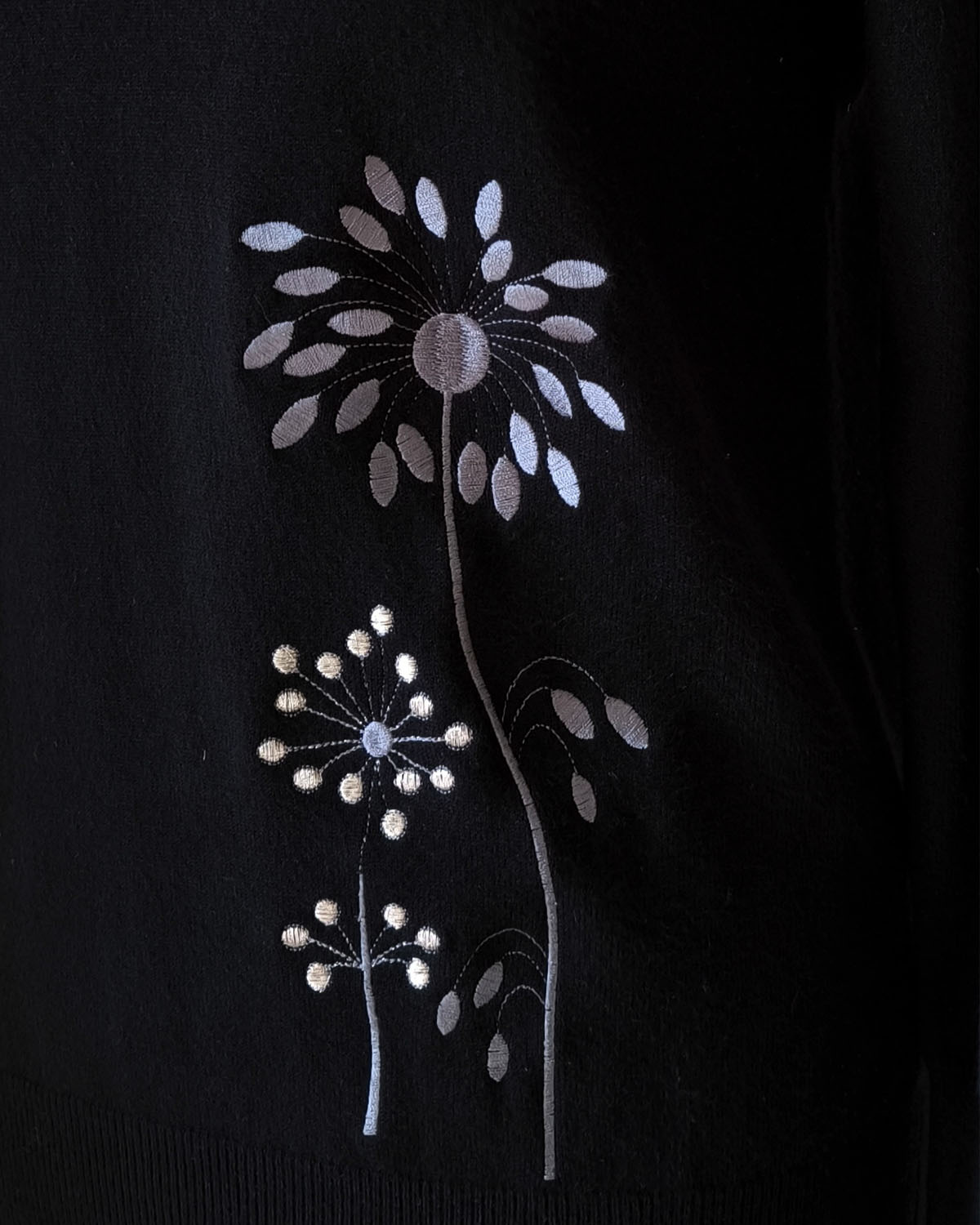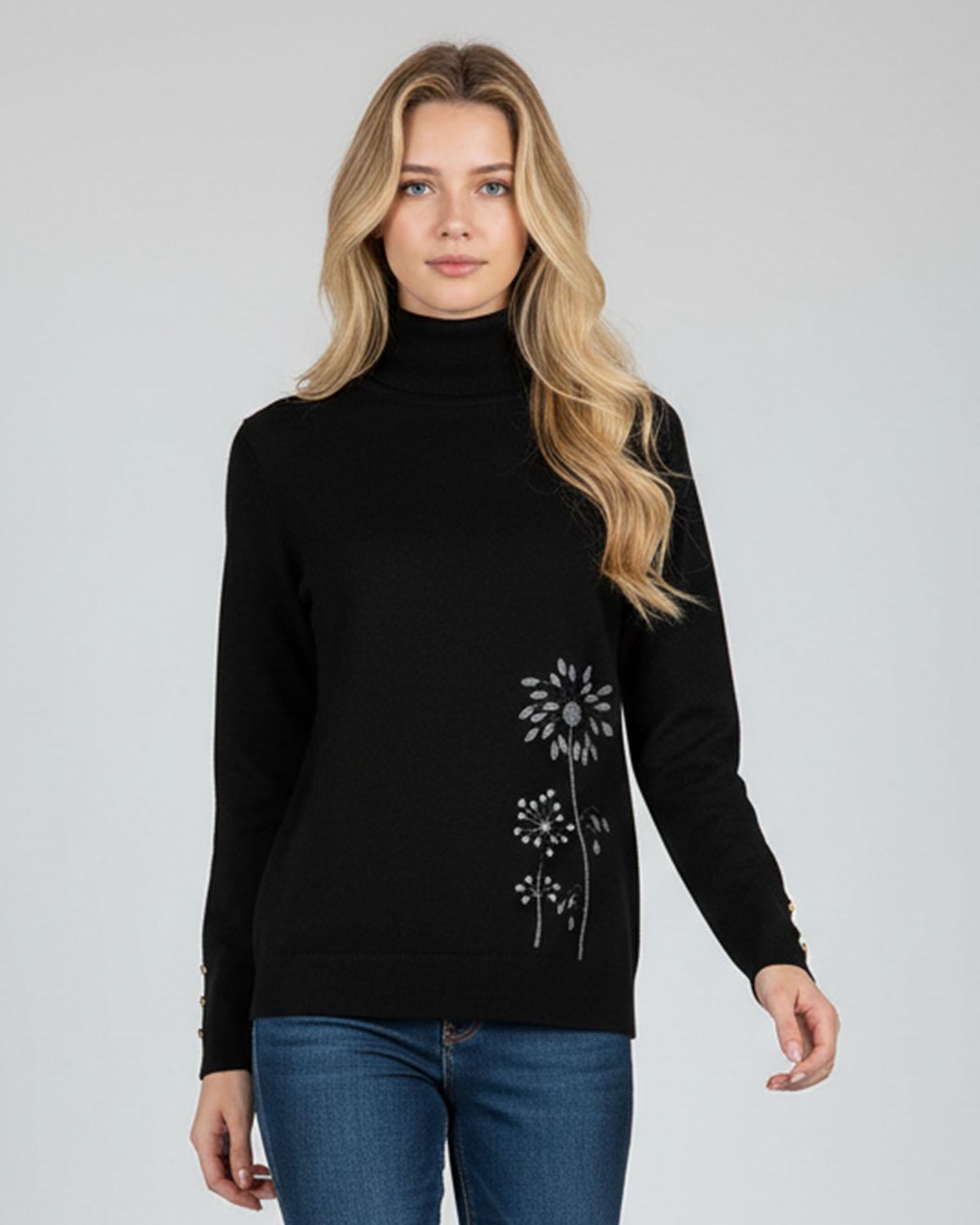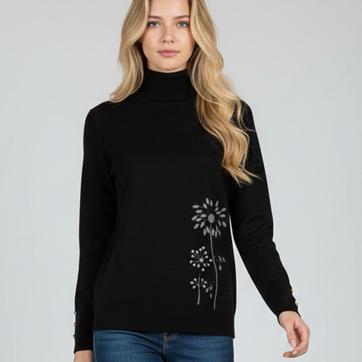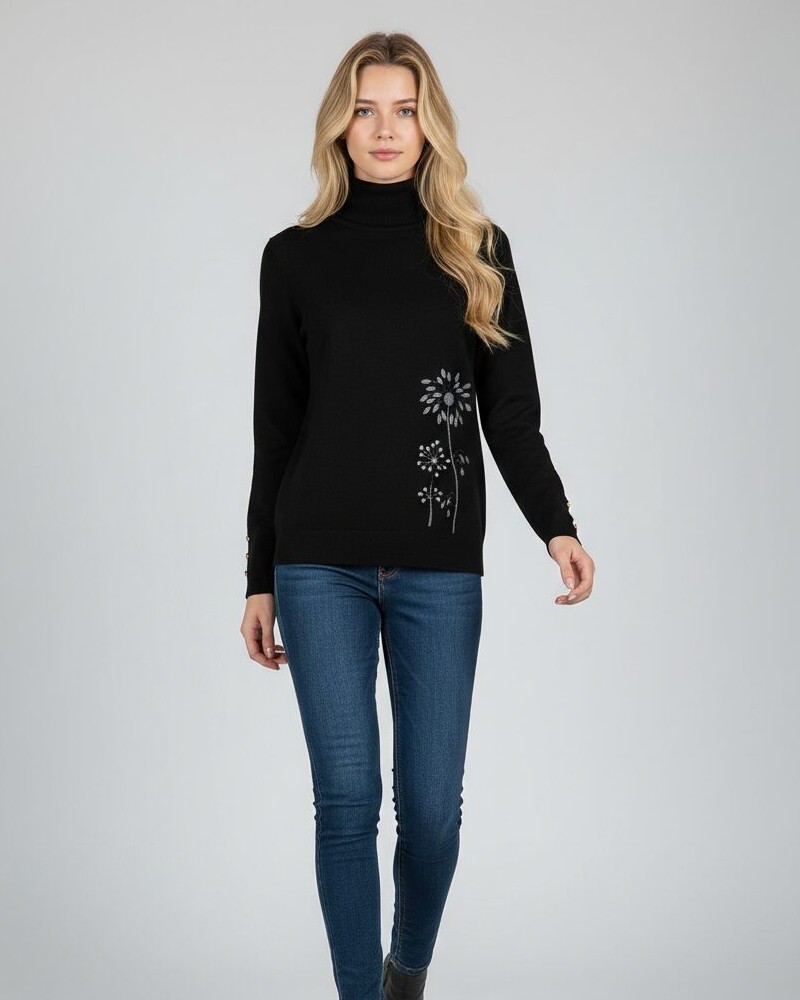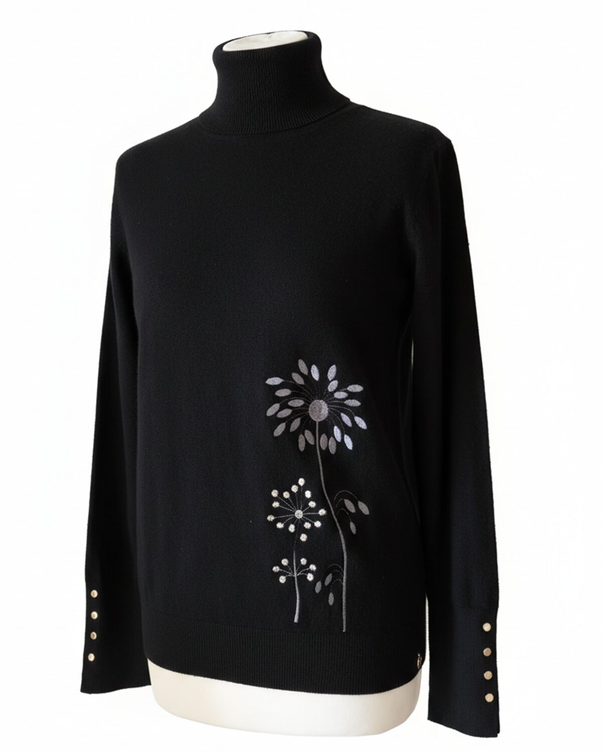 Mõnus pehme S -M suurus kootud kampsun kõrge kaeluse ja mansitikandiga redisainitud lillemotiividega ees allääres ja seljaosal õla peal. Varrukaotstes soonikul metallsed nööbid.