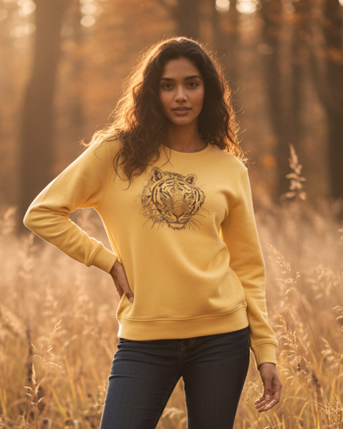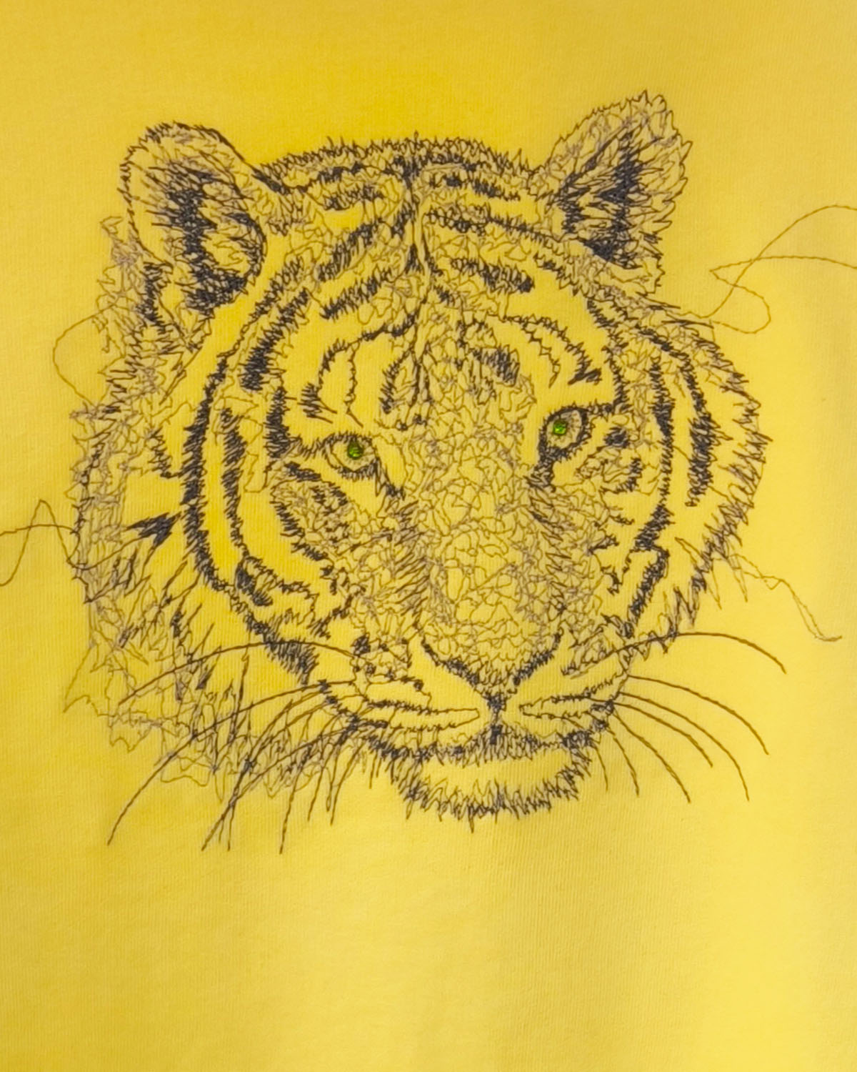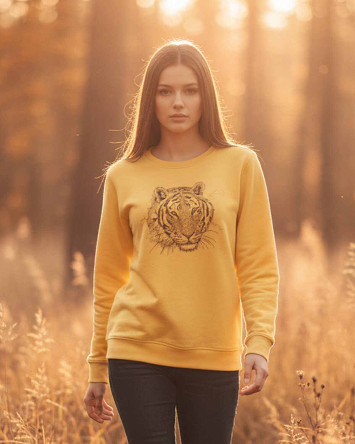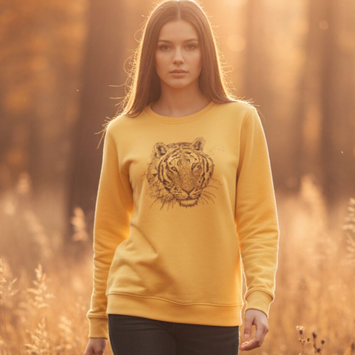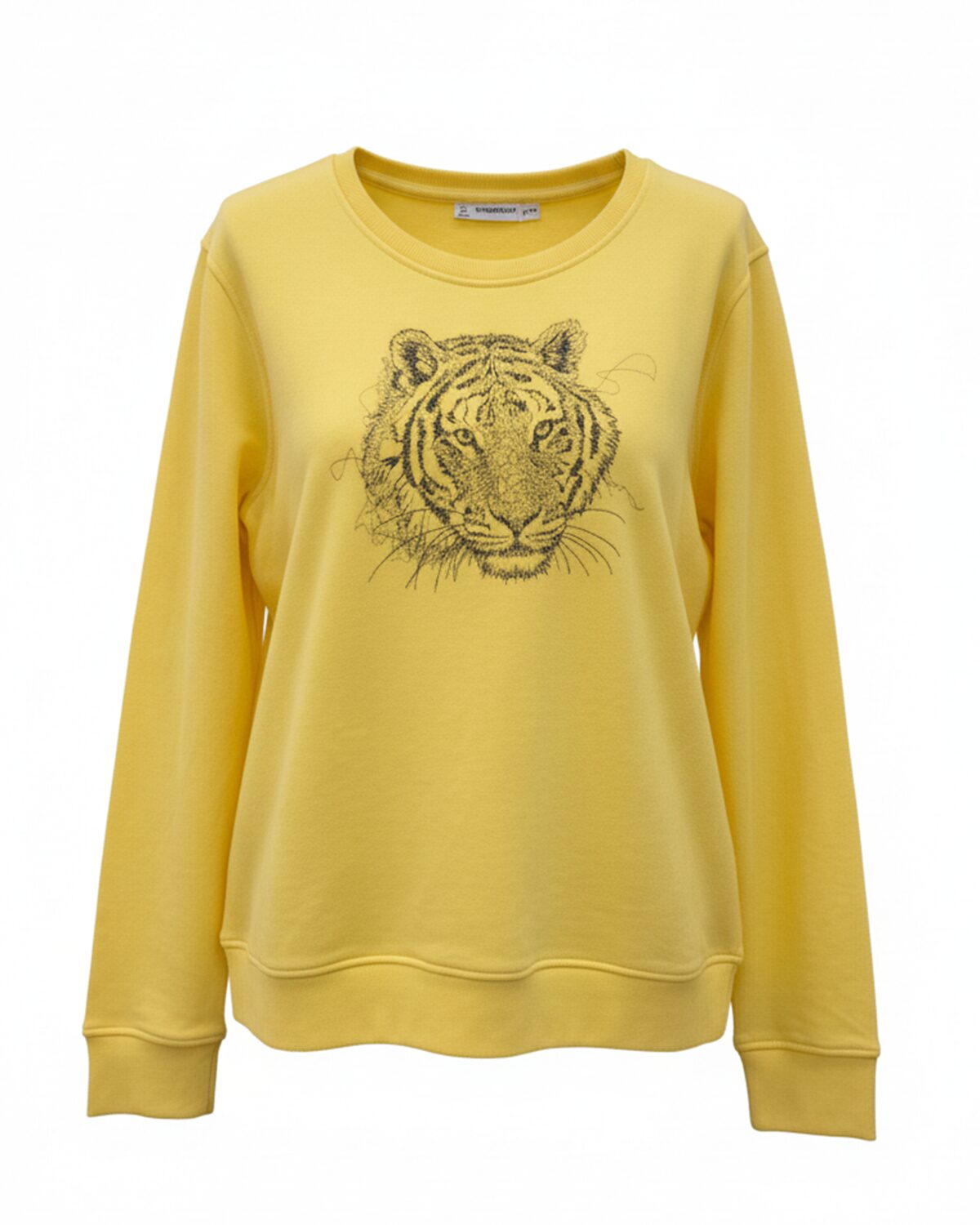 Tikitud tiigripildiga (Cyncopia Embroidery Design kolletsioonist) ja efektsete Swarovski kristallsilmadega mõnus aasalise sisepinnaga kollane pusa naistele. Masintikand ei kulu ja seda võib triikida.