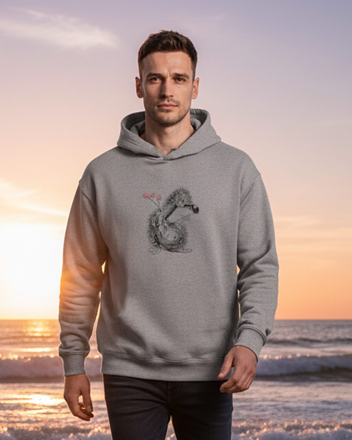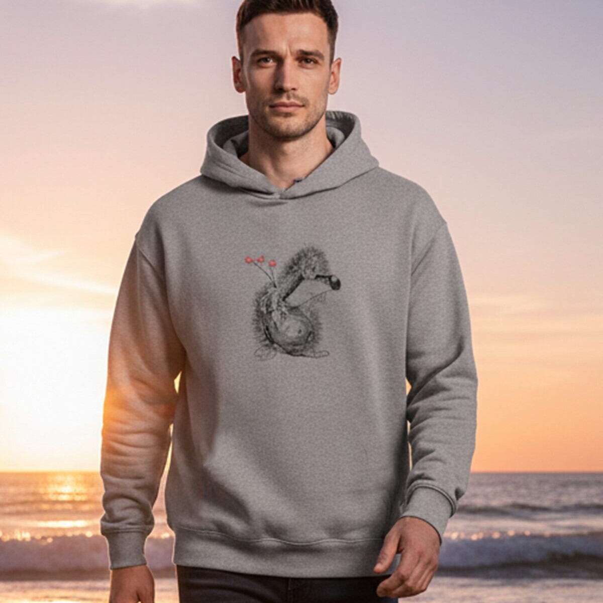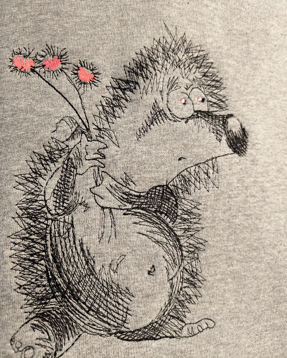 Siili pildiga avaralõikeline, kapuutsi ja ilma taskuteta helehall unisex suuruses pusa, siili silmadeks efektsed Swarovski kristallid. Tikandipilt ei kulu ja seda võib triikida.