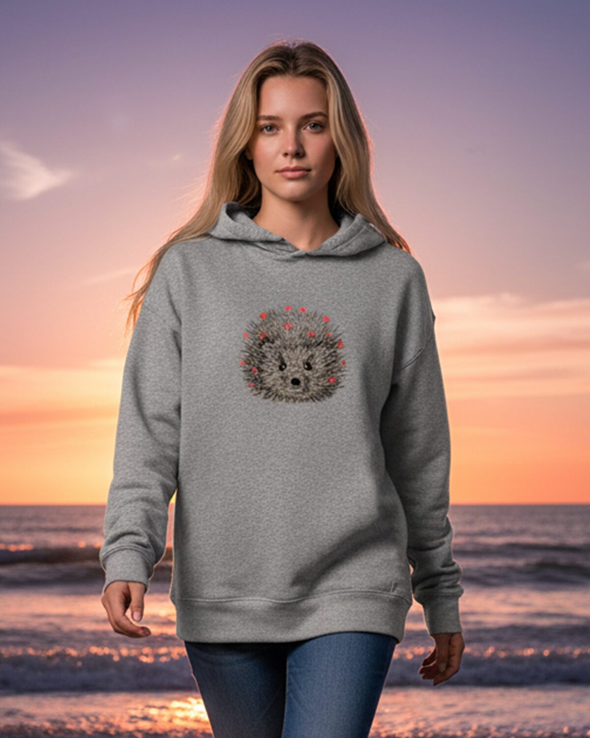 Armsa siili pildiga avaralõikeline helehall unisex suuruses pusa, siili silmadeks efektsed Swarovski kristallid. Tikandipilt ei kulu ja seda võib triikida.
