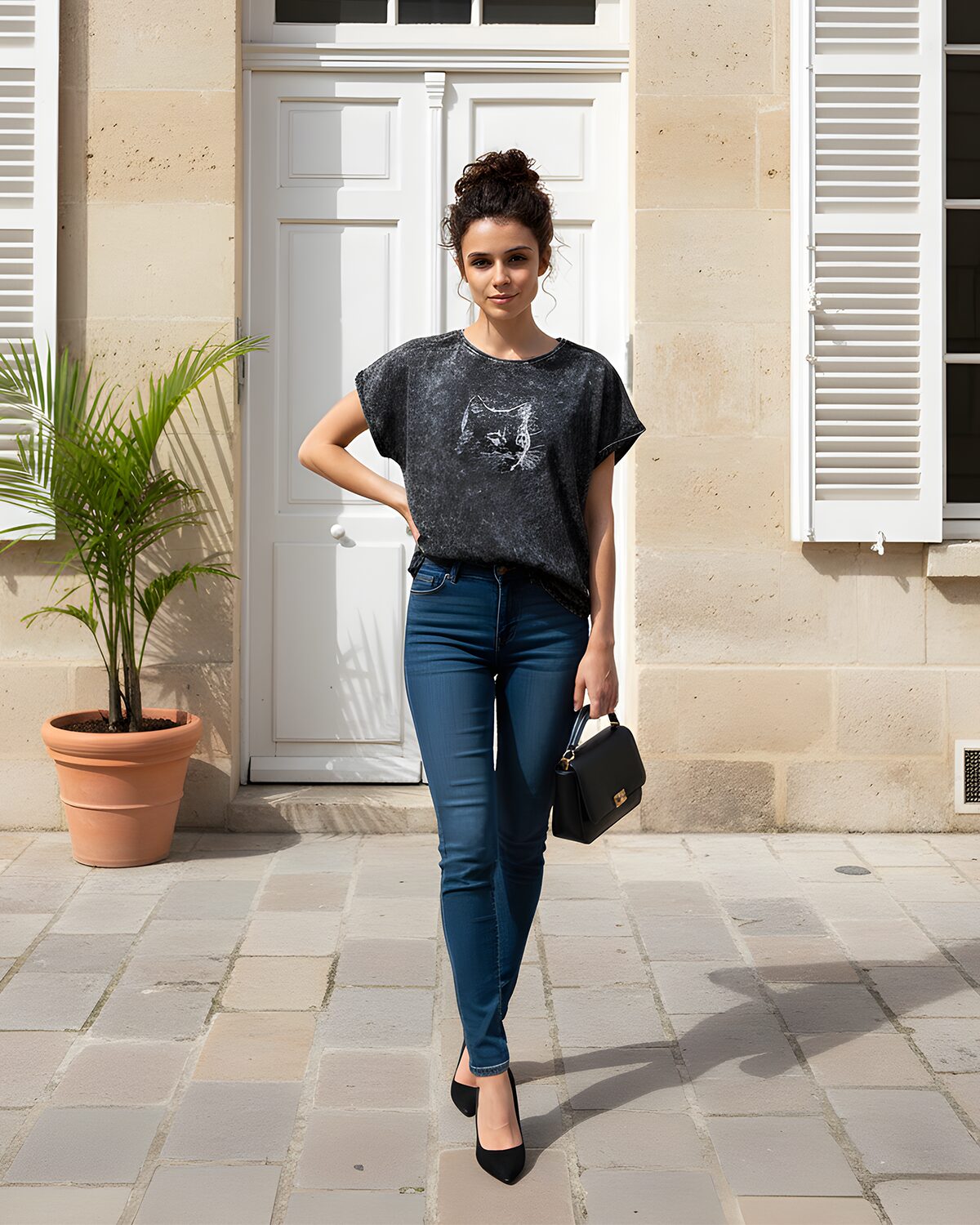 Kulutatud mustriga sirgelõikeline avar pikendatud õlaga T-särk masintikitud salapärase kassipildiga mille silmadeks on kasutatud Swarovski kristalle.