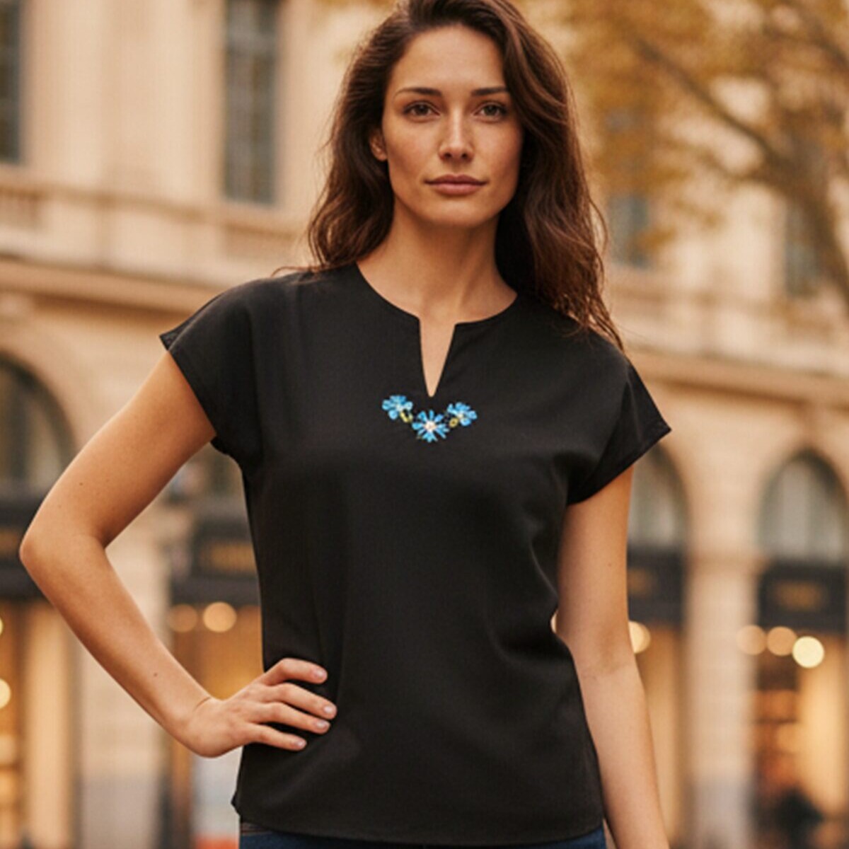 Kehakuju järgiv V ava ja O kaelusega naiselik pluus DesigRi poolt kujundatud masintikandis rukkilillemotiiviga.