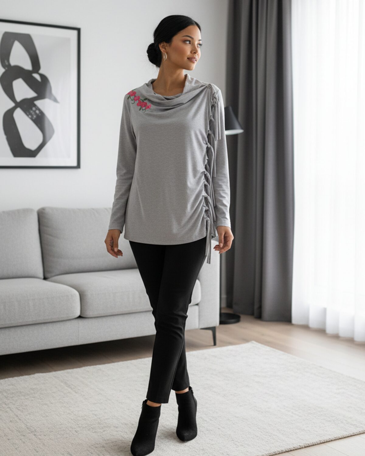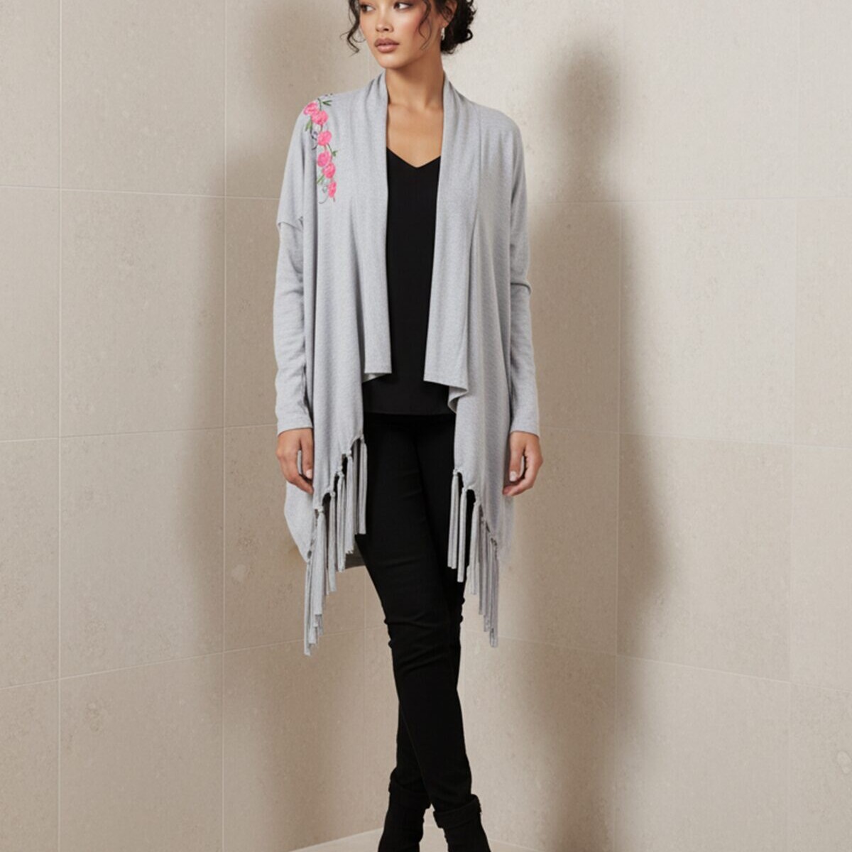 Narmaste ja nööbiga eest kinnitatav murtudsüdamete tikandiga kardigan.