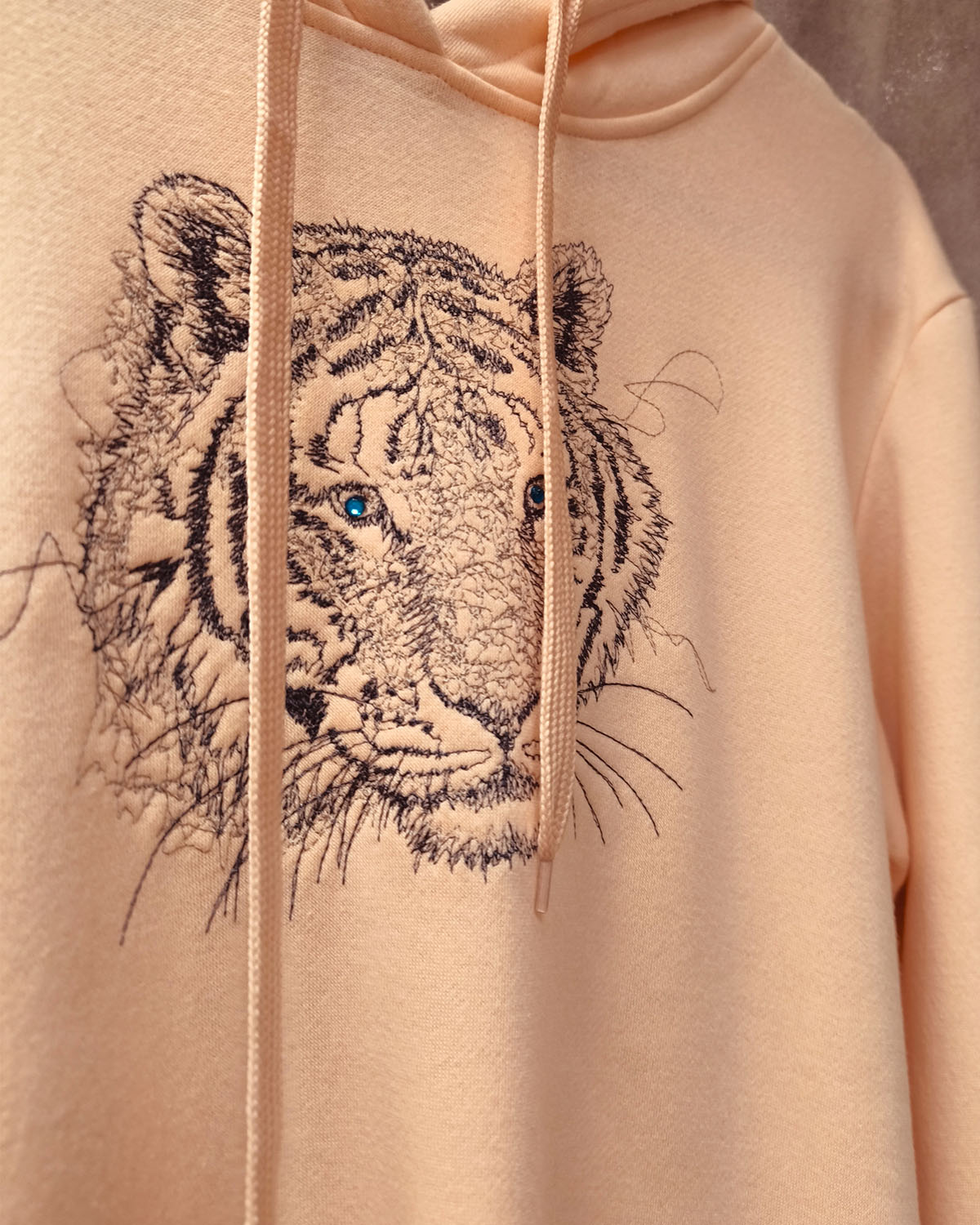Kahekihilise kapuutsi, küljetaskute ja soonikutega allääres, uhutud sisepinnaga virsikuvärvi pusakleit masintikandis tiigripildiga Cyncopia Embroidery kollektsioonist.