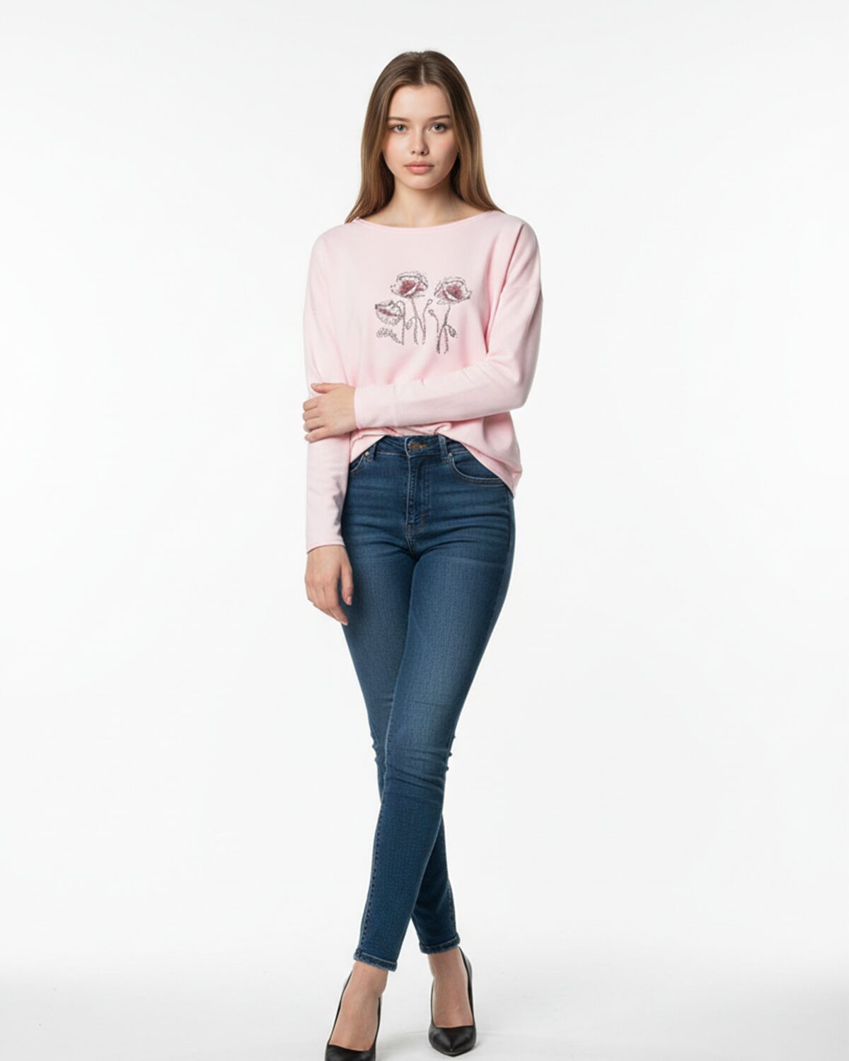 Mooni motiividega avaralõikeline ja mugav pusa pikendatud õla ning poolviimistletud alläärega, õie südamikus säramas Swarovski kristallid. Tikandipilt ei kulu ja seda võib triikida.