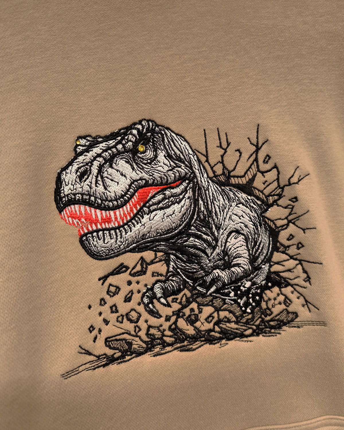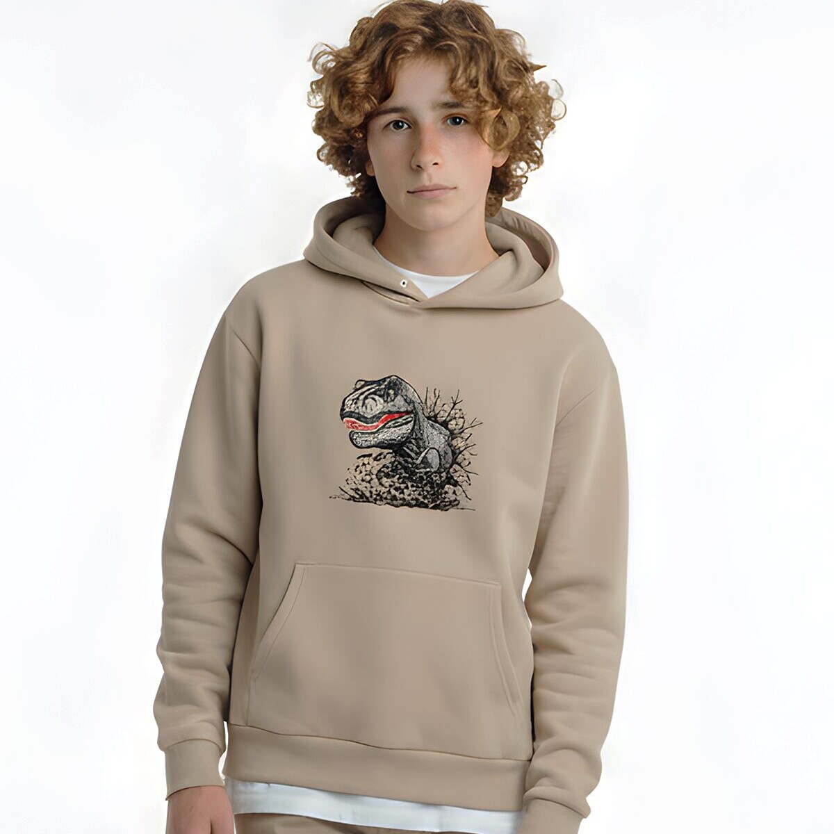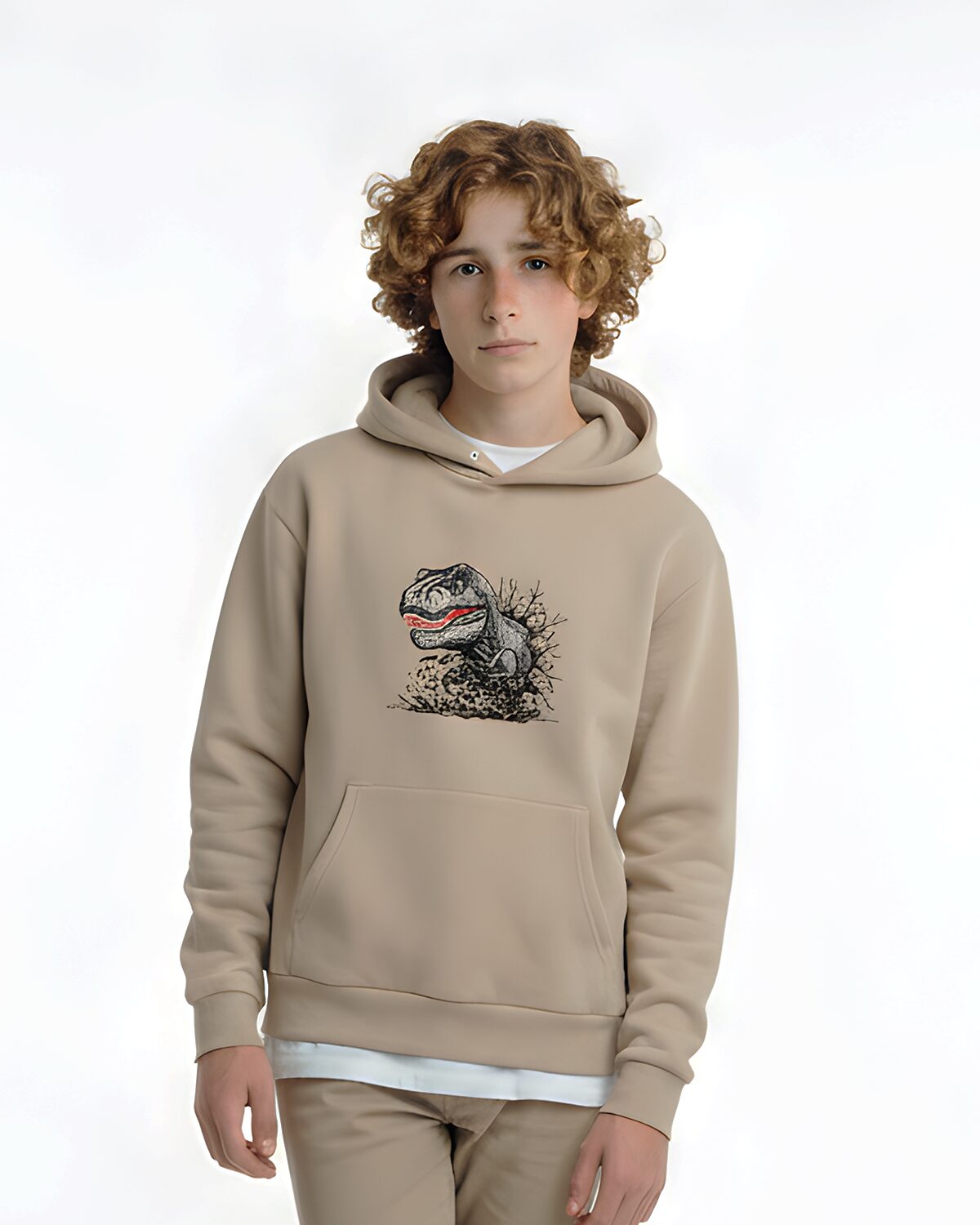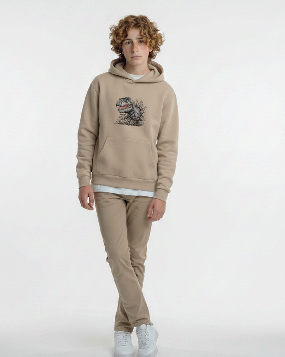 Paksem, liivavärvi, kahekihilise kapuutsi ja kängurutaskuga oversize pusa masintikandis pildiga. Suurus S.