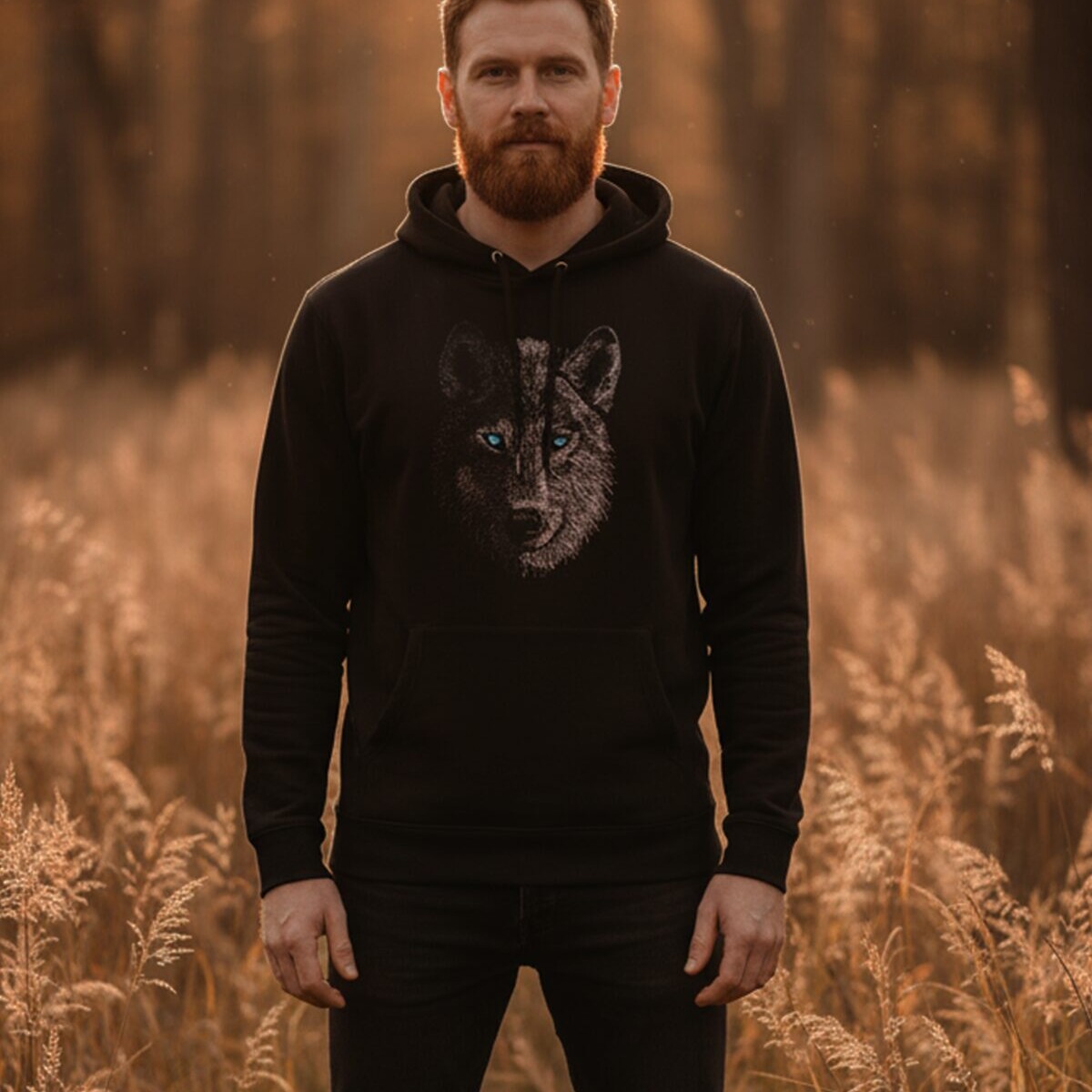 Masintikitud hundi pildiga, harjatud sisepinna, kahekihilise kapuutsi ja küljetaskutega mõnusalt keha järgi istuv pusa. Hunditikand Cyncopia Embroidery Design kollektsioonist, silmadeks sügavust andvad efektsed türkiissinised termokivid. Tikandipilt ei kulu ja seda võib triikida.