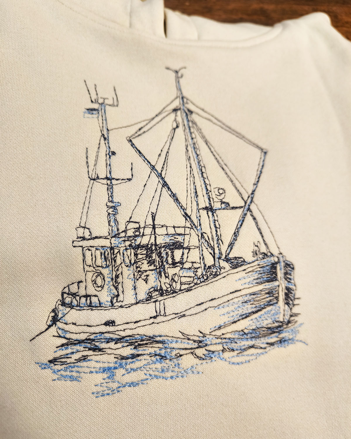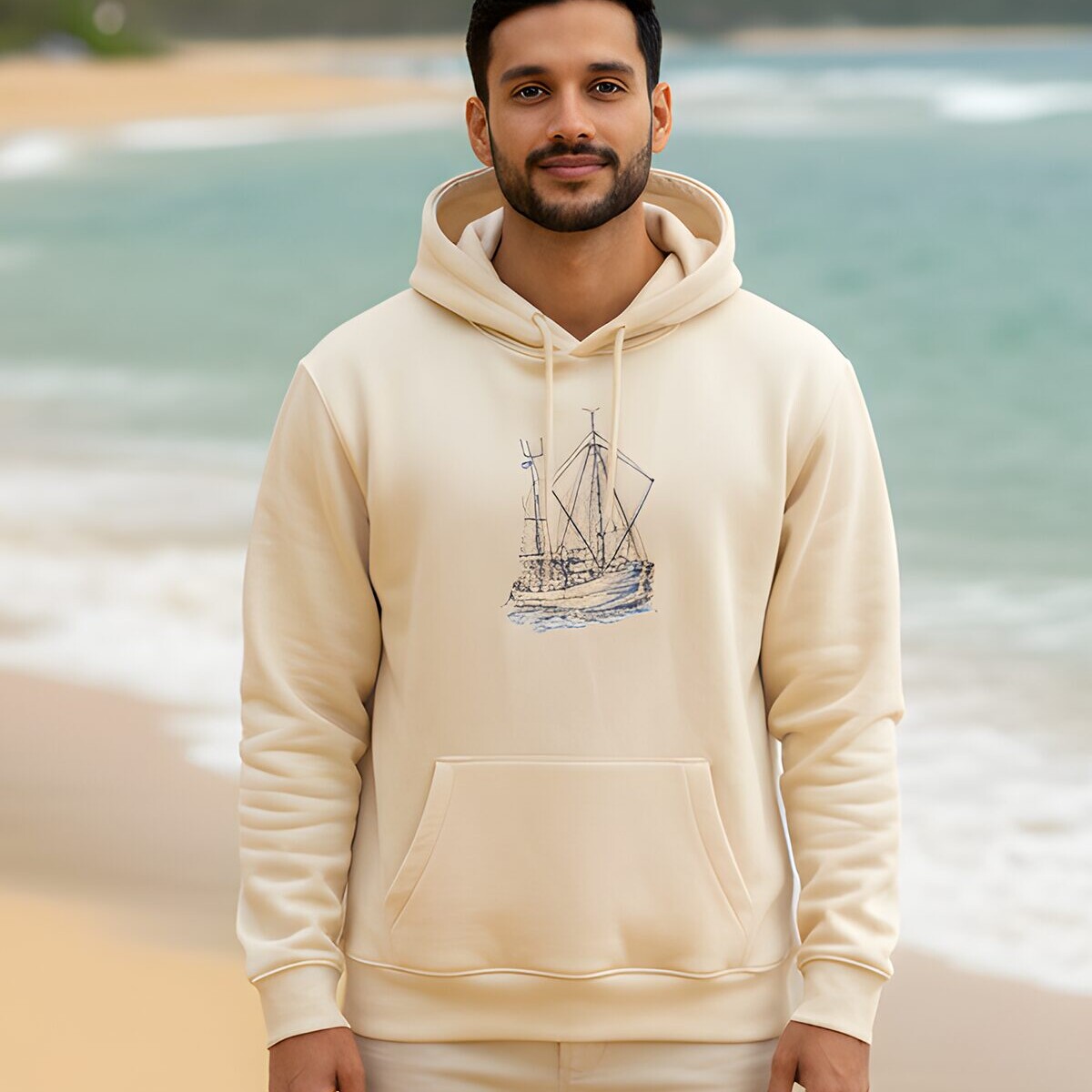 Kängurutasku ja kahekihilise kapuutsiga mõnusalt paksem ja soojem pusa masintikandis kalapüügilaeva pildiga, mis ei kulu ja mida võib triikida.