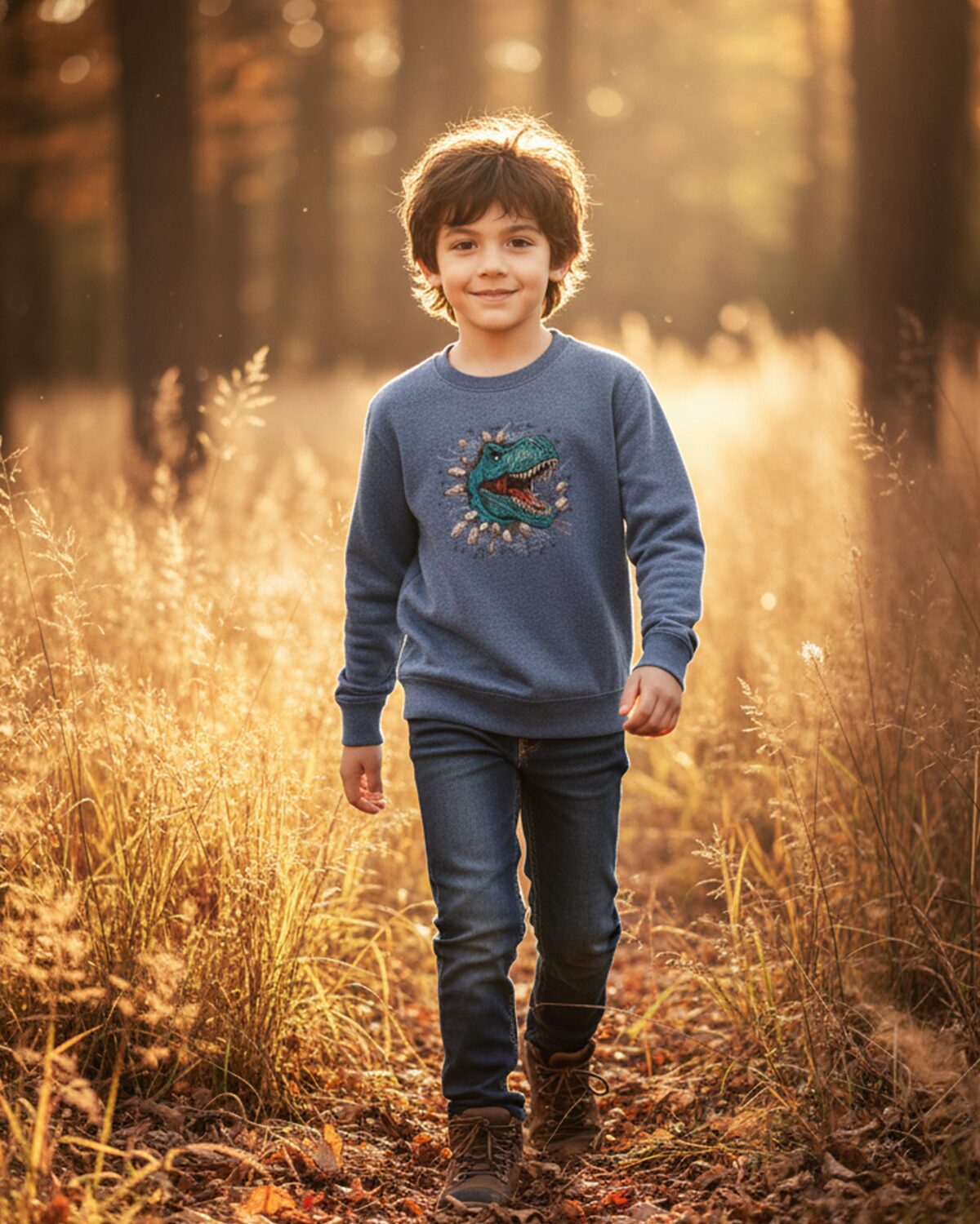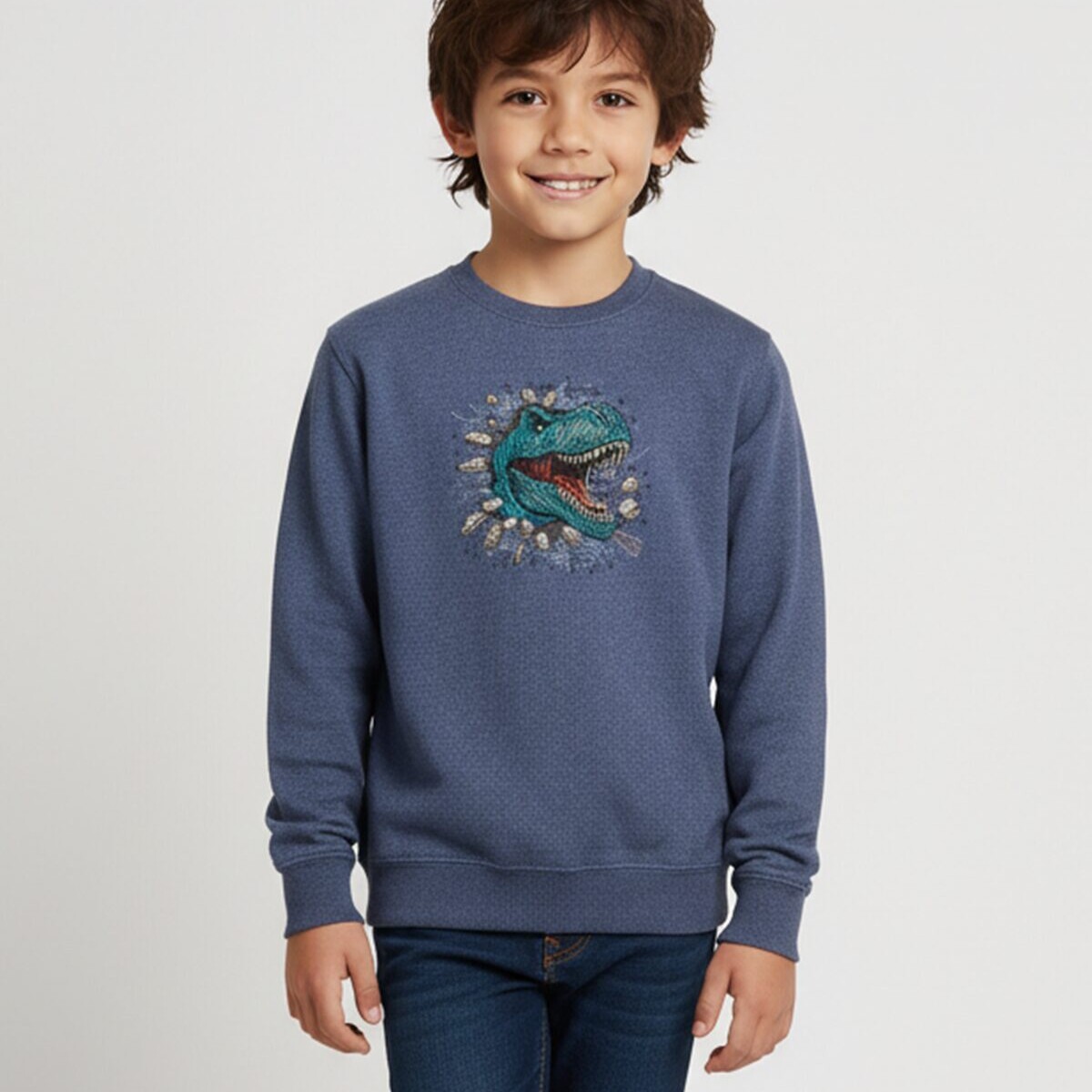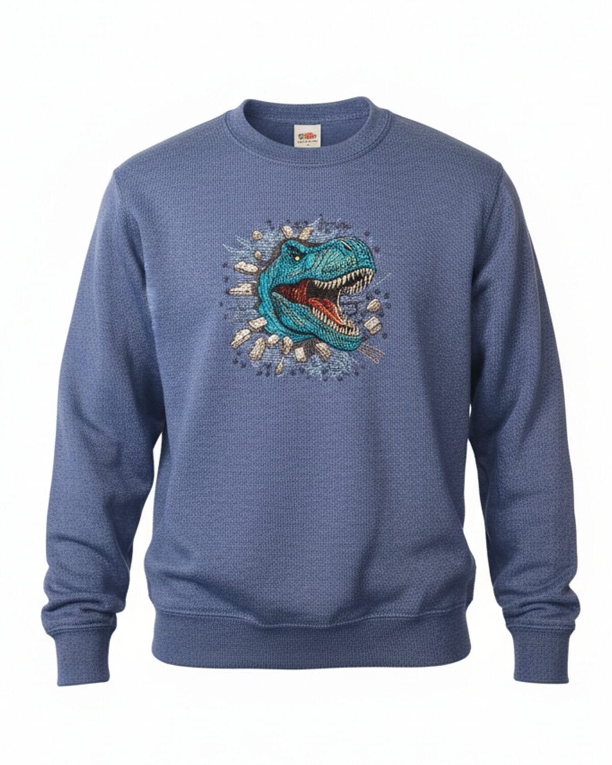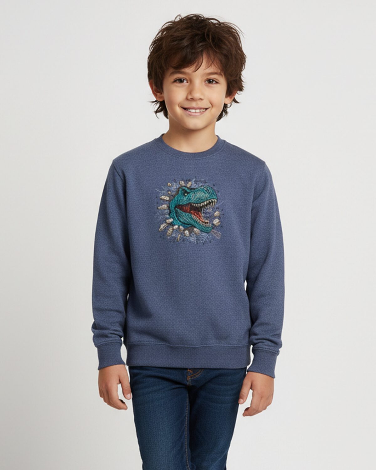 Masintikitud dinosaurusega mõnus pusa 7-8 aastasele 128cm lapsele, silmadeks efektsed Swarovski kristallid. Tikandipilt ei kulu ja seda võib triikida.