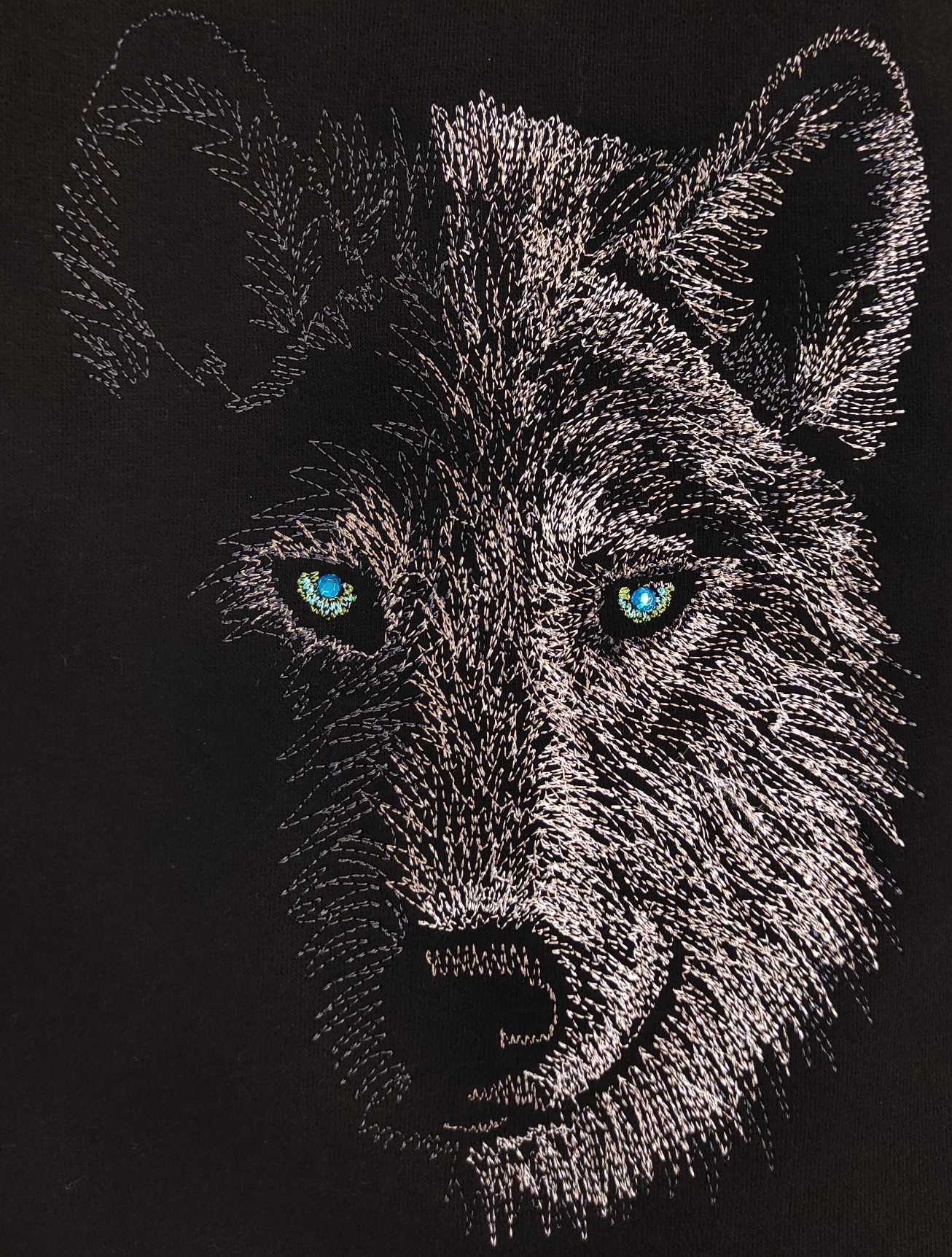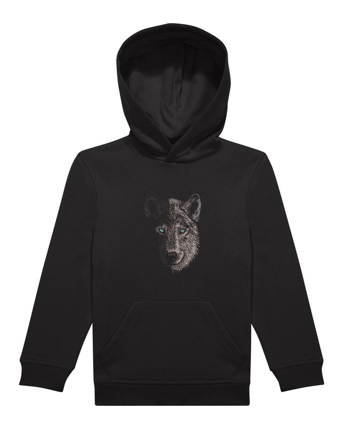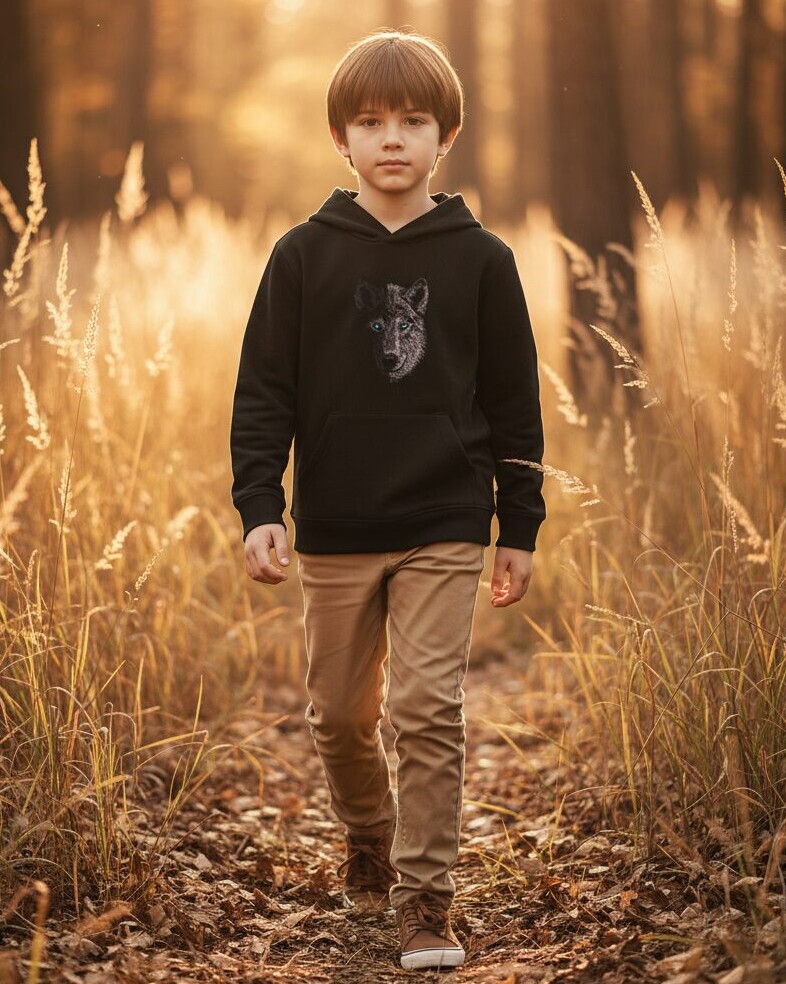 Kapuutsi ja kängurutaskuga laste pusa masintikandis hundipildiga Cyncopia Embroidery Design kolletsioonist, silmadeks efektsed Swarovski kristallid. Tikandipilt ei kulu ja seda võib triikida.
