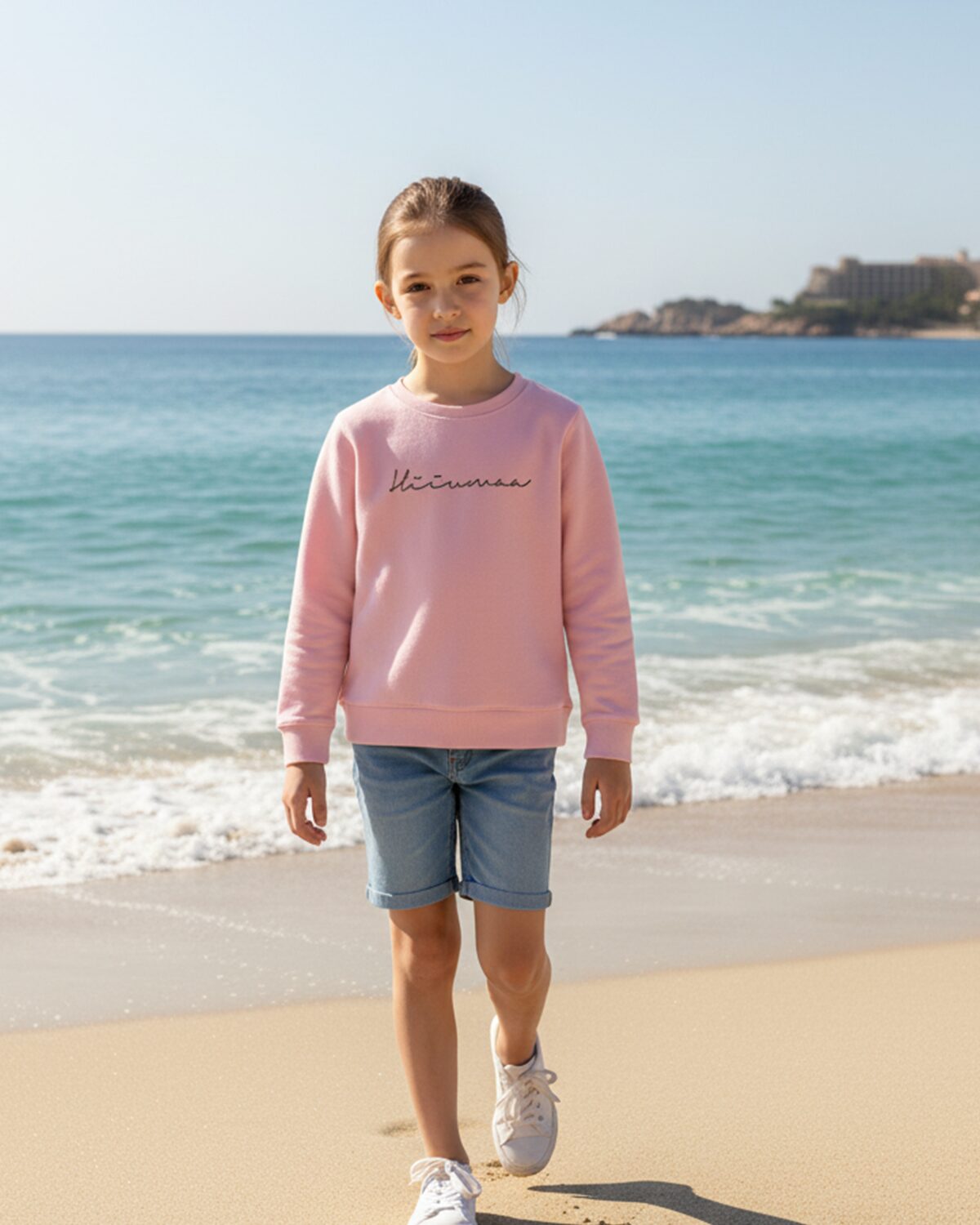 Pehme, harjatud sisepinna ja tikitud Hiiumaa kirjaga pusa lastele. Merelainestiilis Hiiumaa kiri pusal, kujundaja Valdek Alber on peitnud sinna ka hiiu nalja – kaks ii-d tähendavad hiidlaste naerusuud ja täpid nendel hiidlaste naerusilmi.