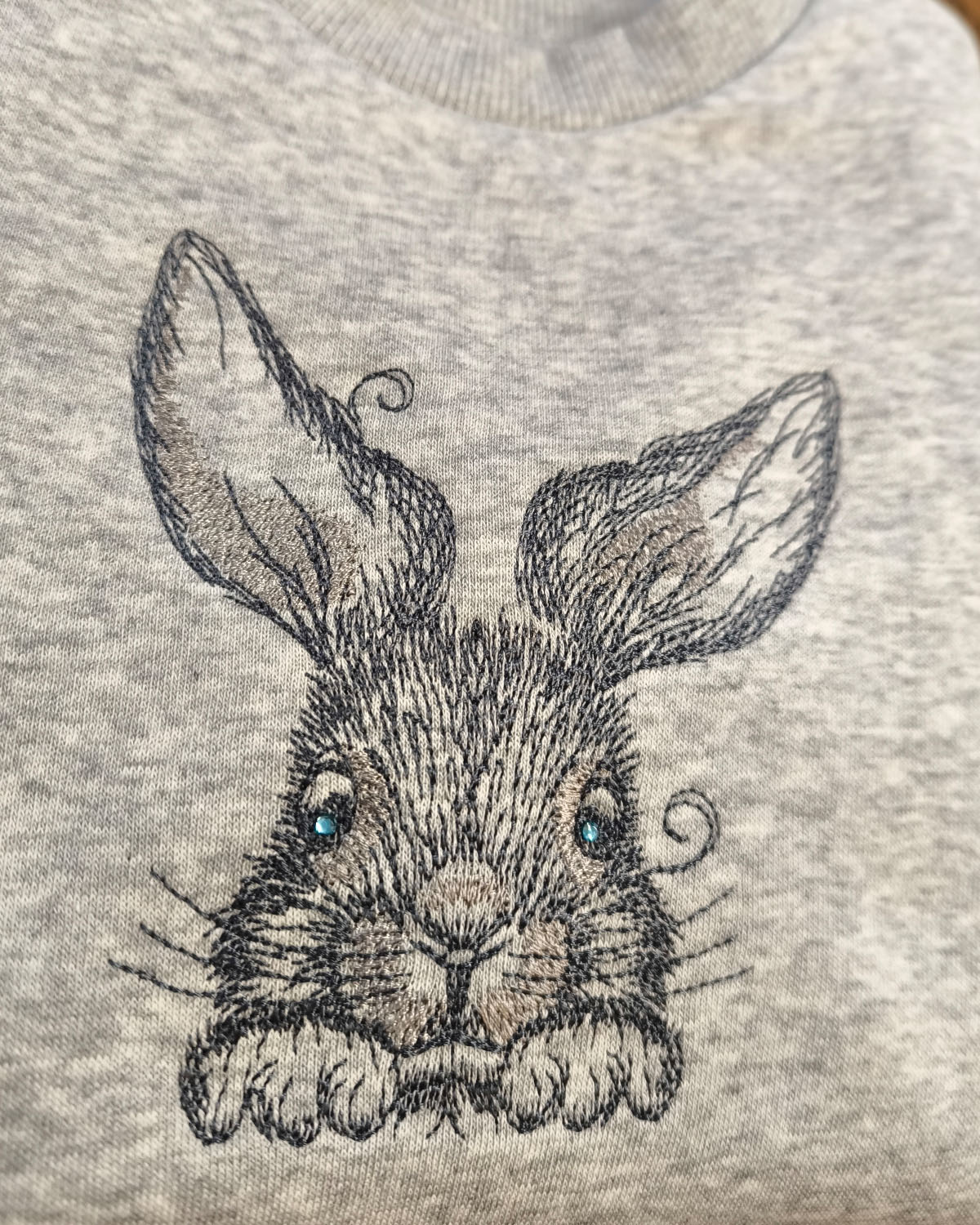 Nunnu jänku pildiga õhem pusa lastele. Jänese silmadeks efektsed Swarovski kristallid 🙂 Tikandipilt Cyncopia Embroidery design kollektsioonist.
