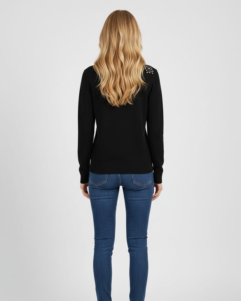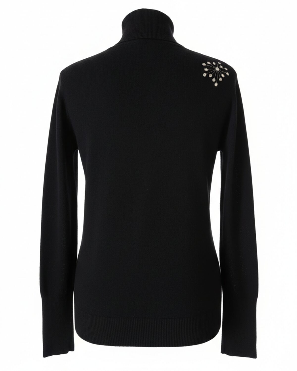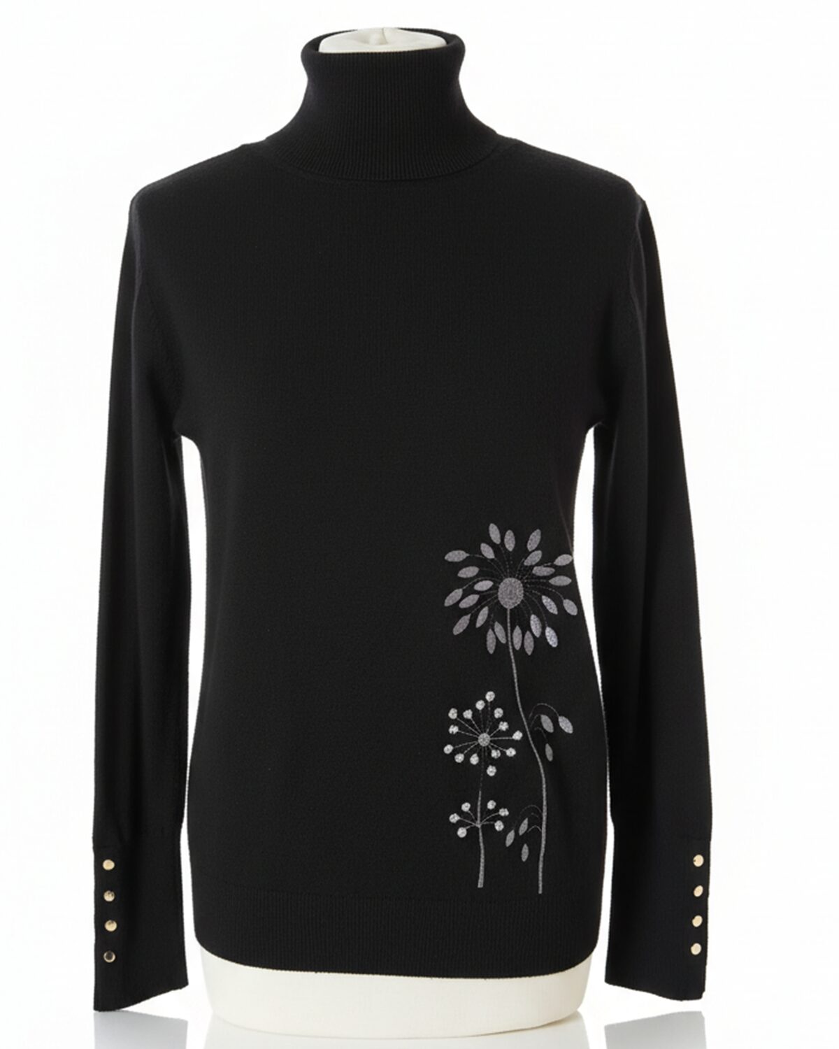 Mõnus pehme S -M suurus kootud kampsun kõrge kaeluse ja mansitikandiga redisainitud lillemotiividega ees allääres ja seljaosal õla peal. Varrukaotstes soonikul metallsed nööbid.