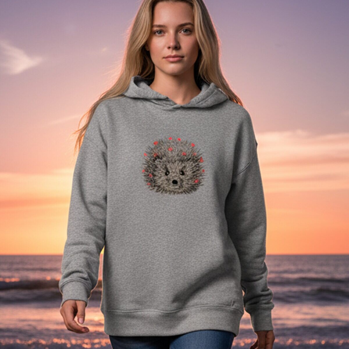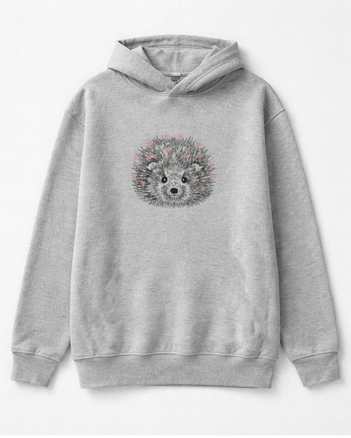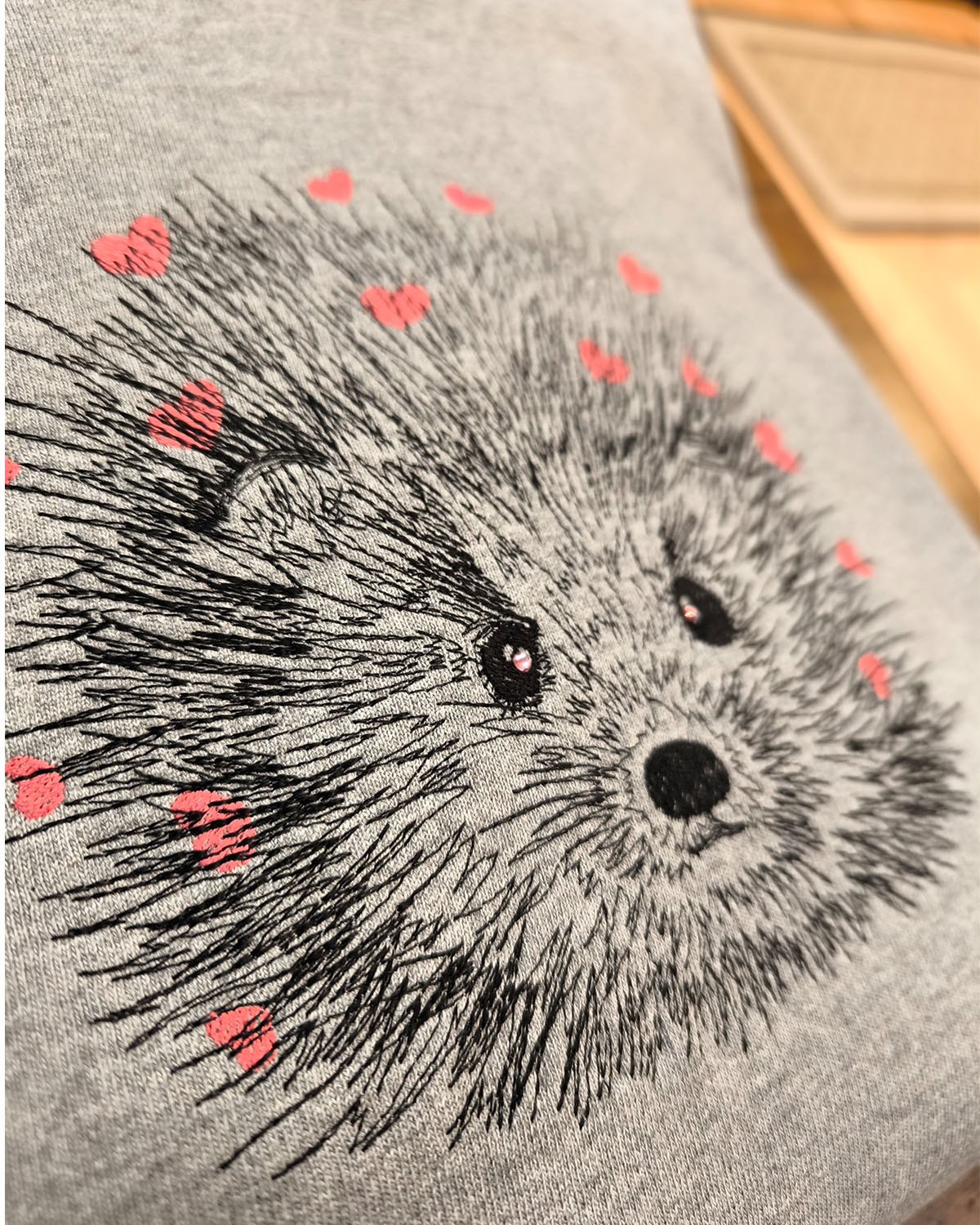 Armsa siili pildiga avaralõikeline helehall unisex suuruses pusa, siili silmadeks efektsed Swarovski kristallid. Tikandipilt ei kulu ja seda võib triikida.