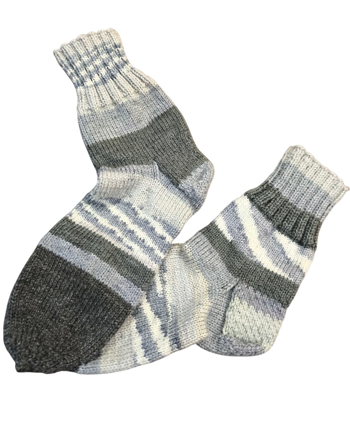 Suure hoole ja armastusega käsitsi kootud hallikirjud villasegused sokid talla pikkusega 24cm ja säär kanna alt mõõdetuna 20cm.