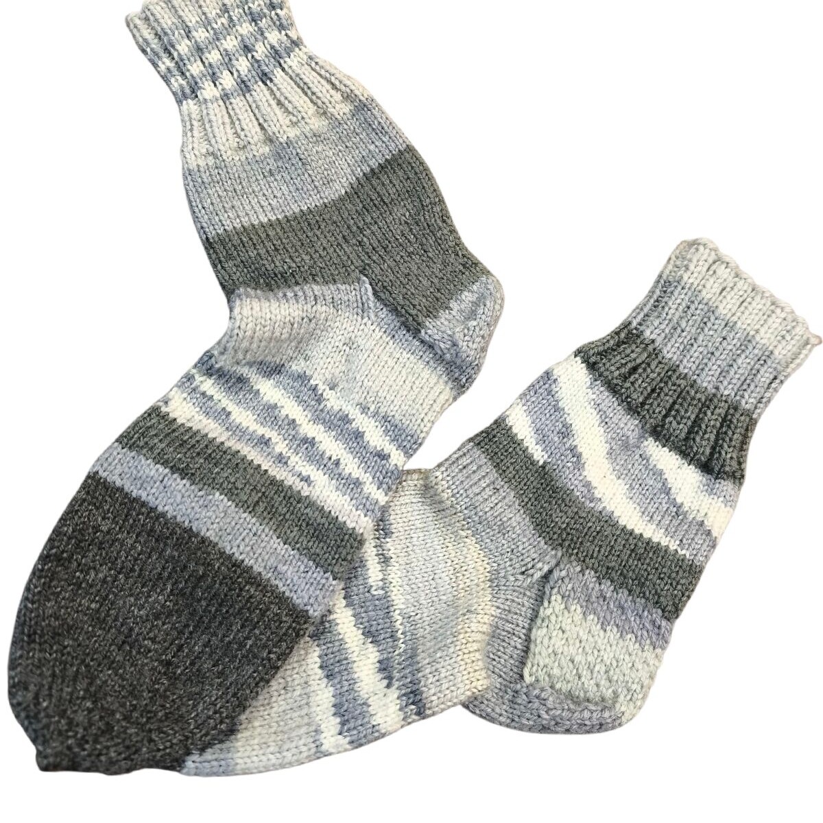 Suure hoole ja armastusega käsitsi kootud hallikirjud villasegused sokid talla pikkusega 24cm ja säär kanna alt mõõdetuna 20cm.