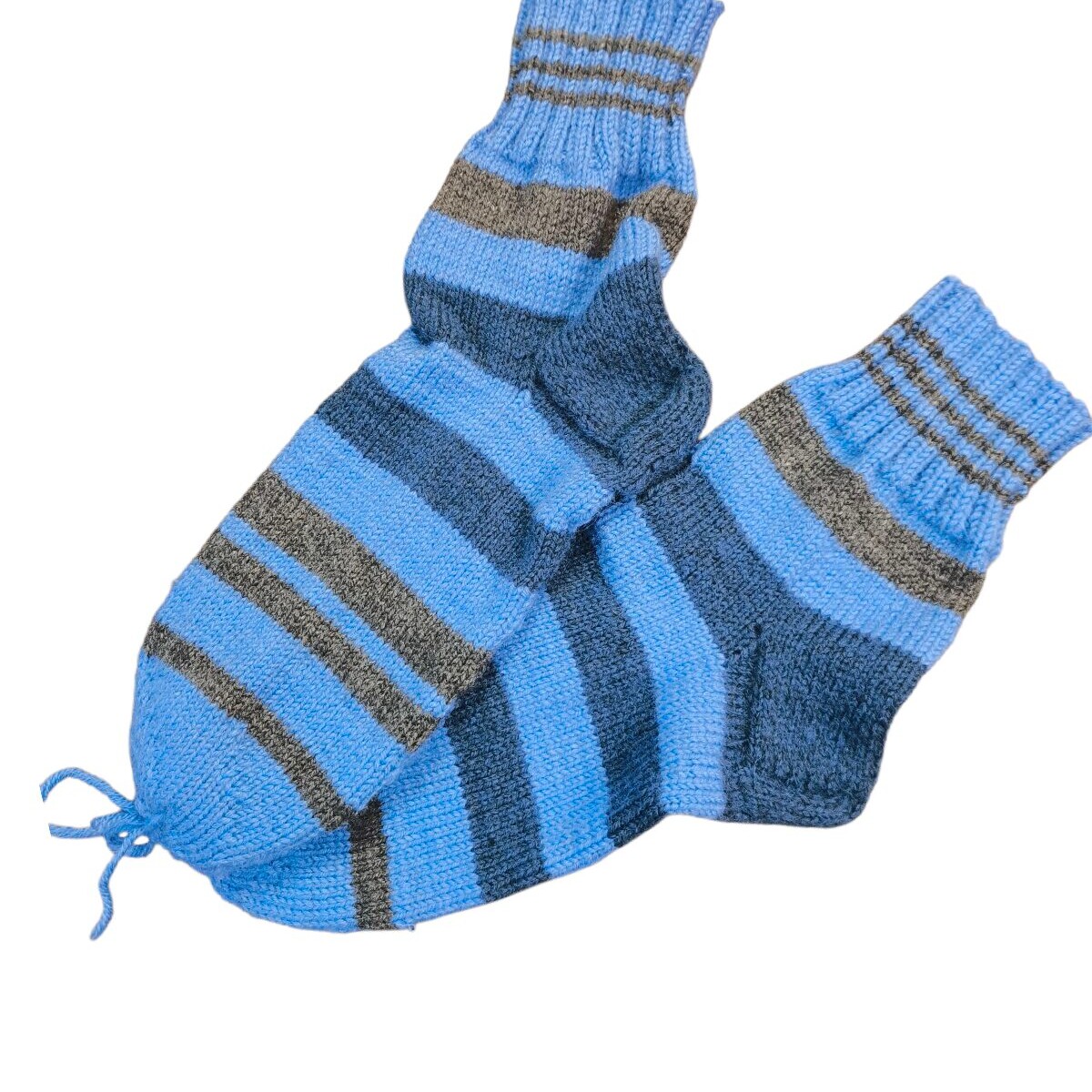 Suure hoole ja armastusega käsitsi kootud triibulised villased sokid, talla pikkusega 26cm ja säär kanna alt mõõdetuna 19cm.