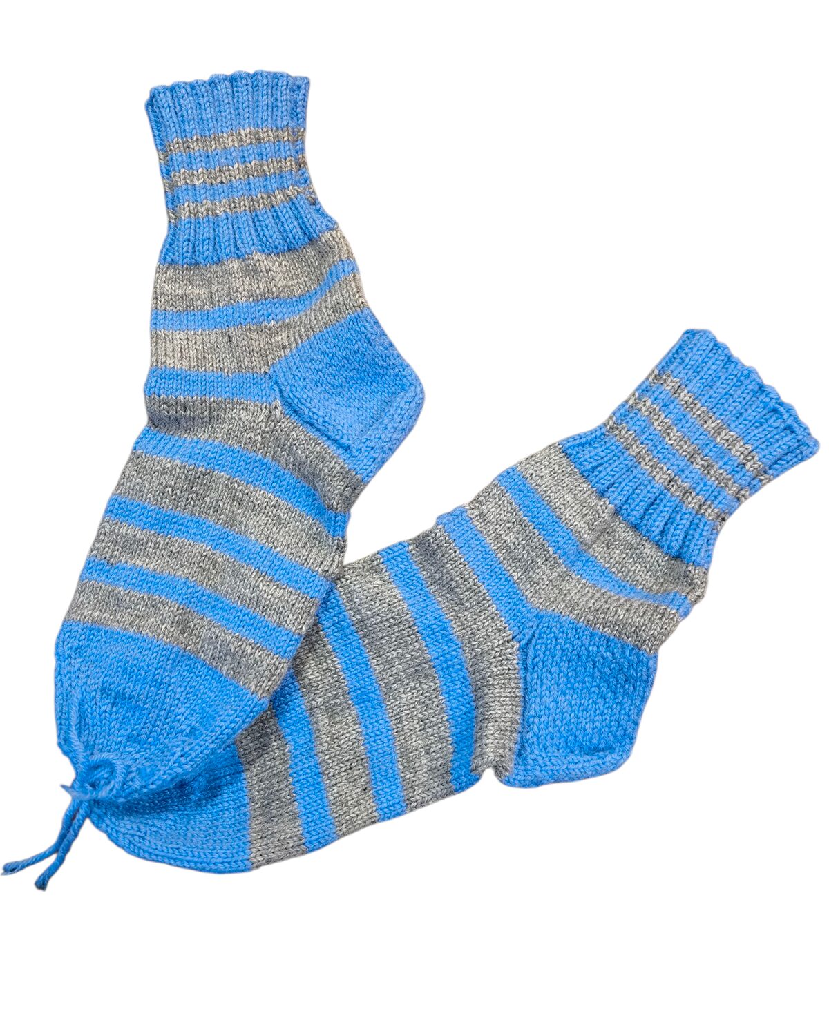 Suure hoole ja armastusega käsitsi kootud halli ja sinise triibulised villased sokid, talla pikkusega 25cm ja säär kanna alt mõõdetuna 20cm.