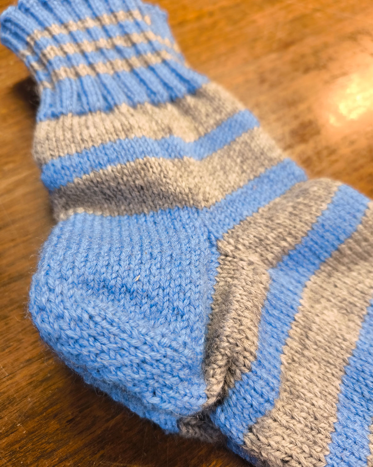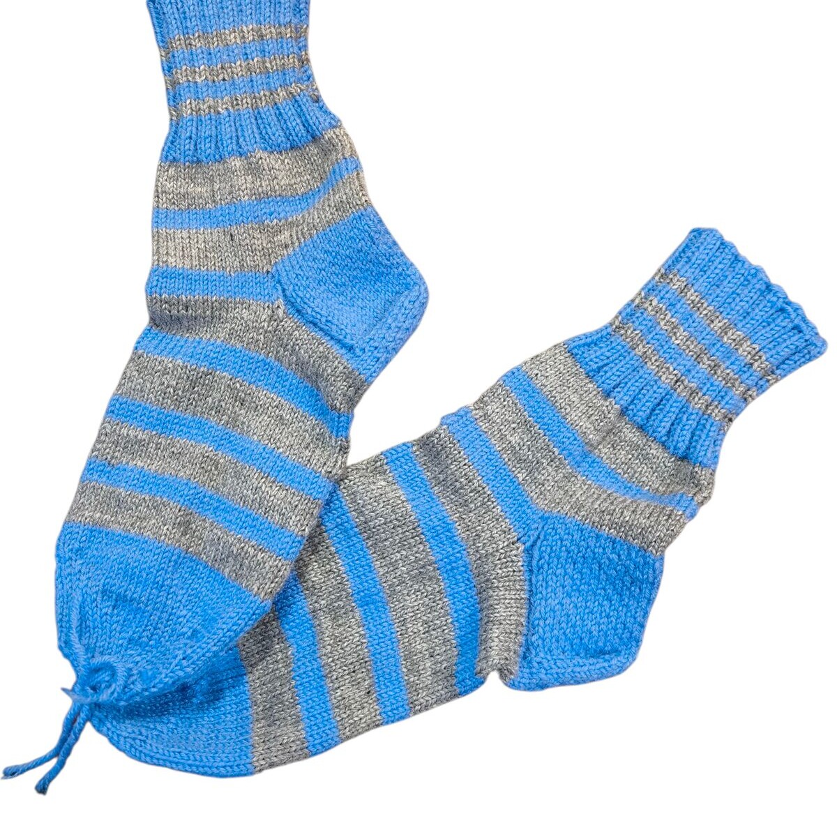 Suure hoole ja armastusega käsitsi kootud halli ja sinise triibulised villased sokid, talla pikkusega 25cm ja säär kanna alt mõõdetuna 20cm.