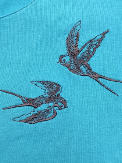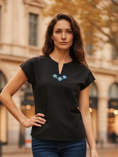 Mugavast venivast materjalist V ava, püstkrae ja 3/4 varrukatega naiselik pluus, ees ristpistes masintikandis Hiiumaa kindakirja motiiv (kalakoljukiri).
