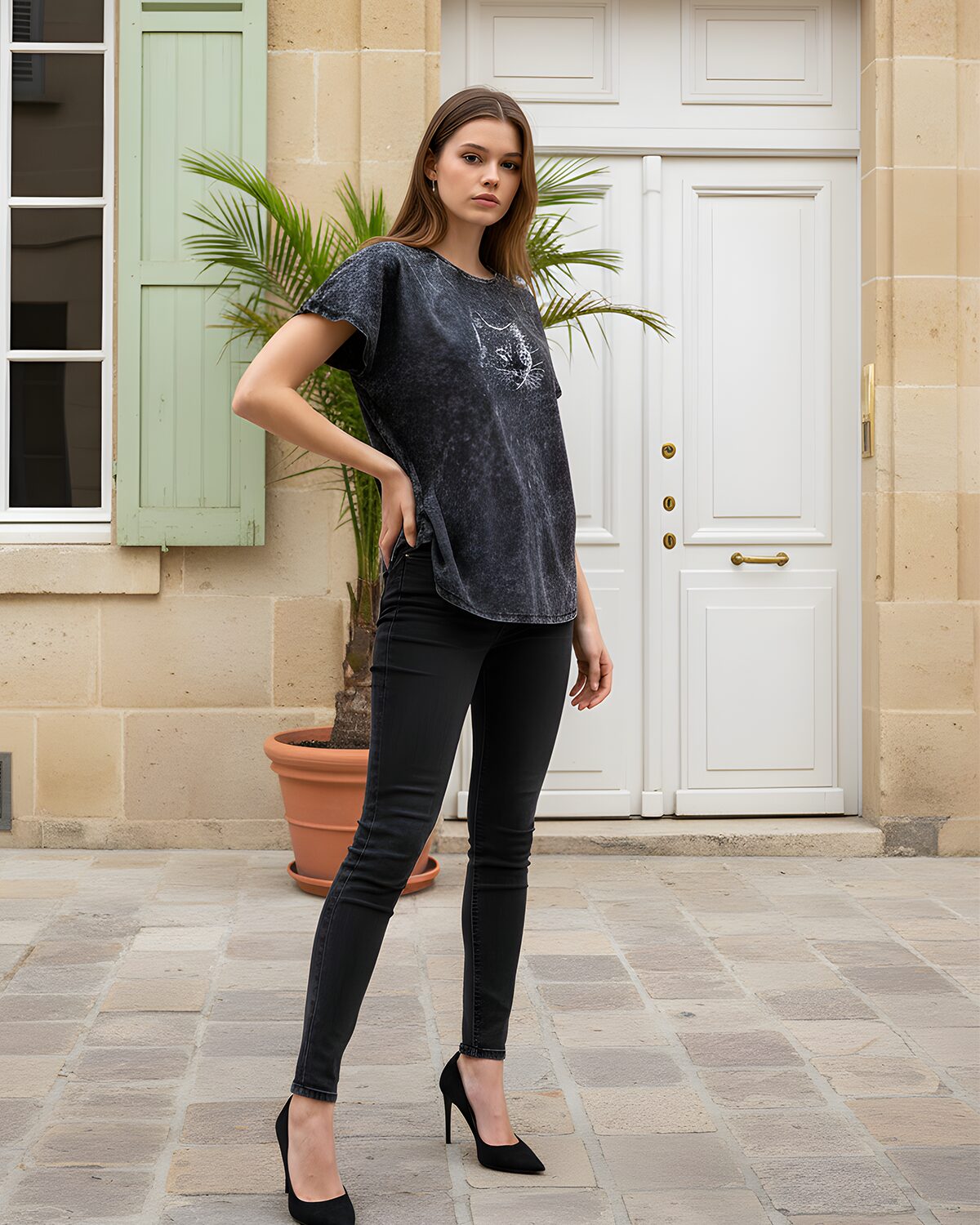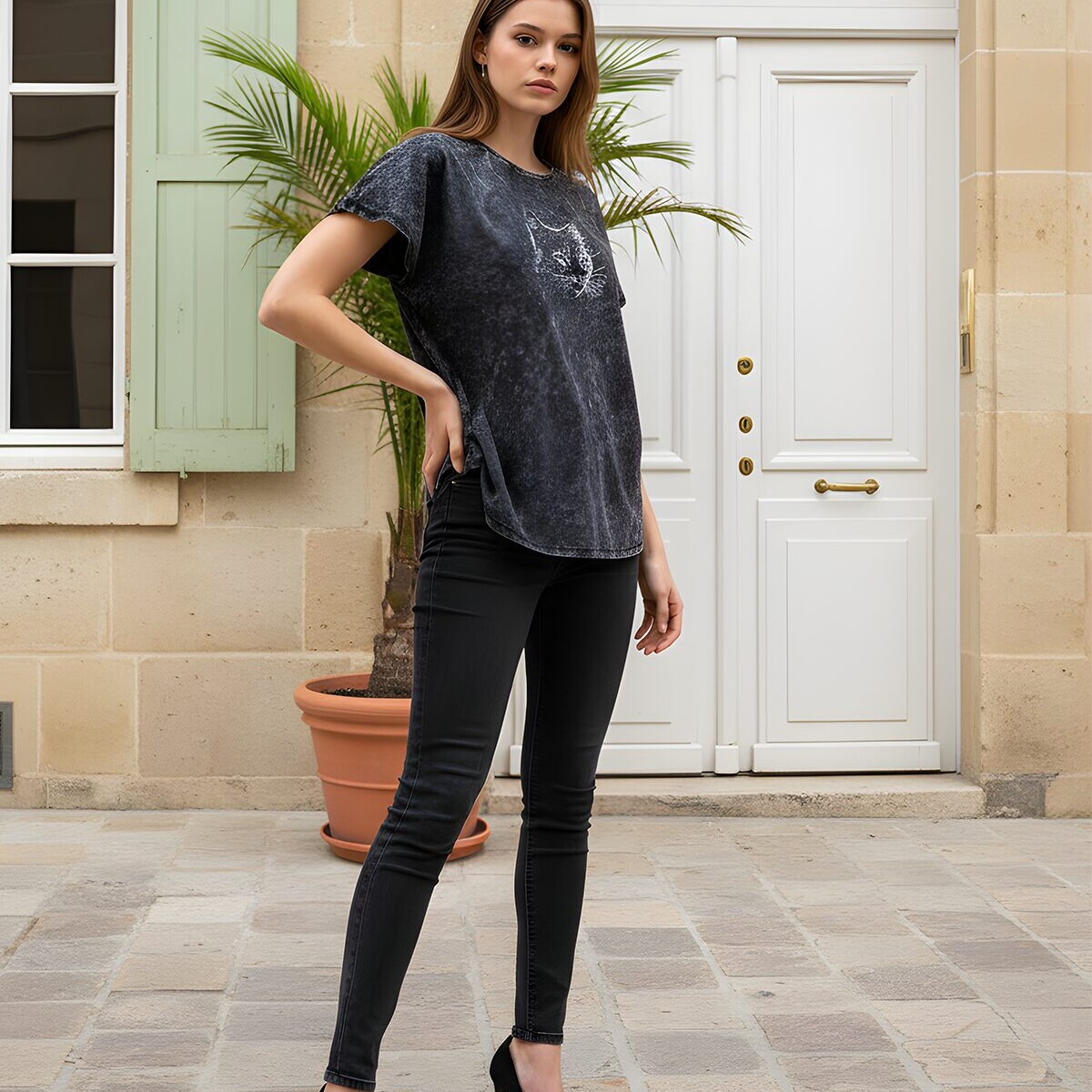 Kulutatud mustriga sirgelõikeline avar pikendatud õlaga T-särk masintikitud salapärase kassipildiga mille silmadeks on kasutatud Swarovski kristalle.